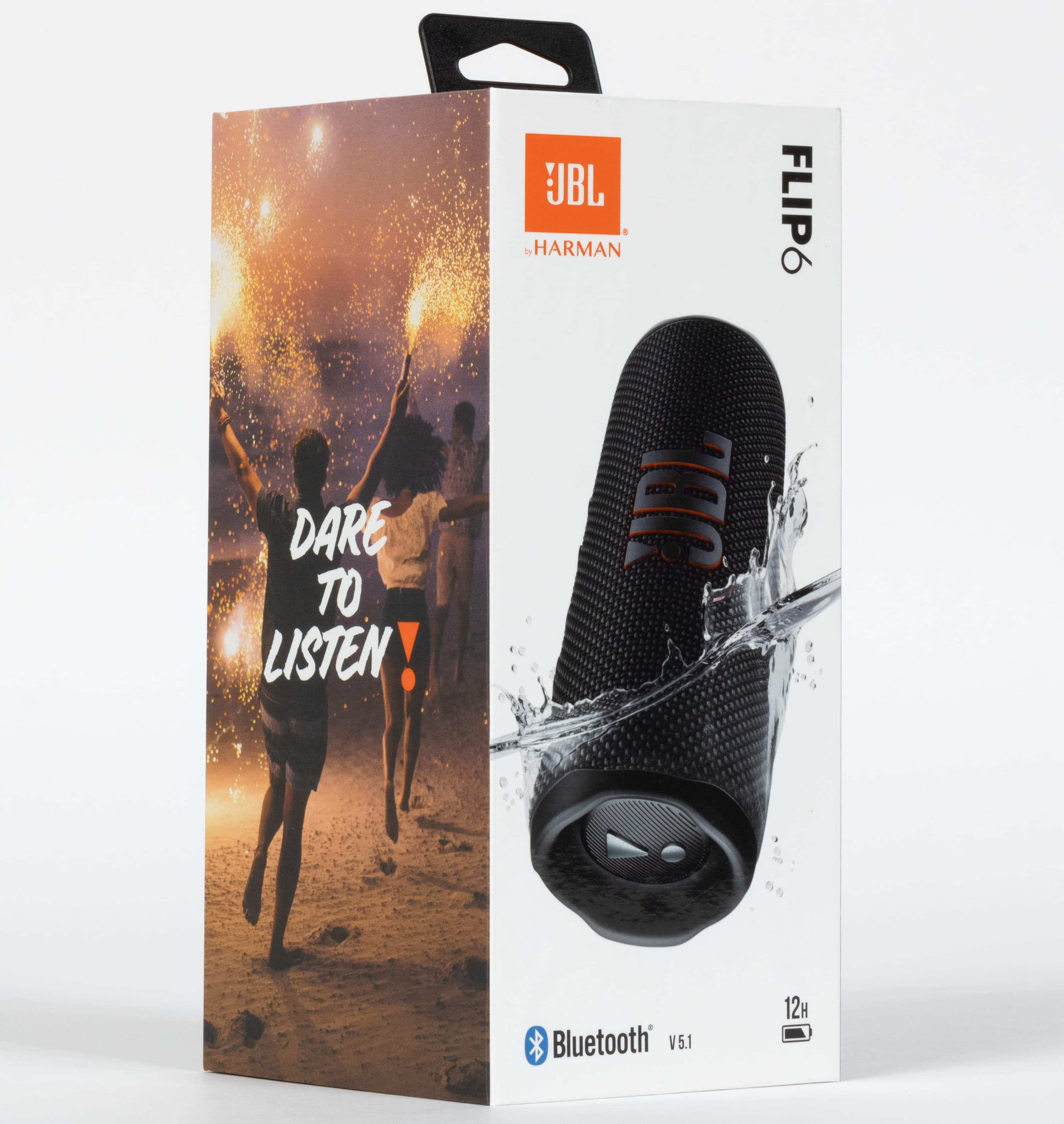 Поставляется JBL Flip 6 в симпатичной картонной коробке с откидной крышкой, удерживаемой магнитным креплением. Дизайн хорошо знаком поклонникам бренда и не менялся довольно давно, равно как и слоган «Dare to listen!», который можно перевести как «Решись послушать!». Внутри колонка удерживается ложементом из пенистого материала и хорошо защищена от повреждений при перевозке.