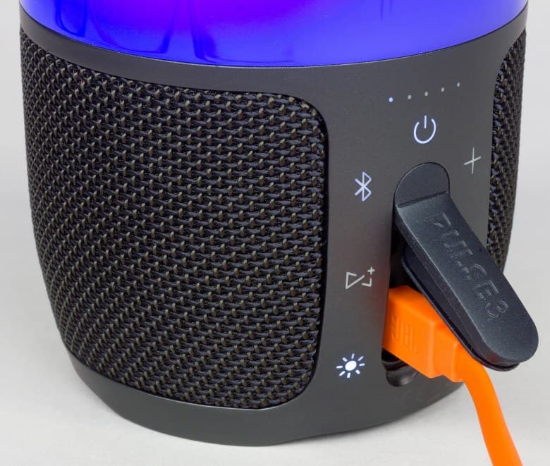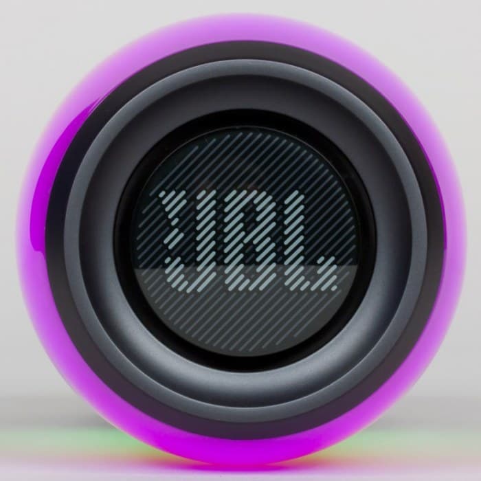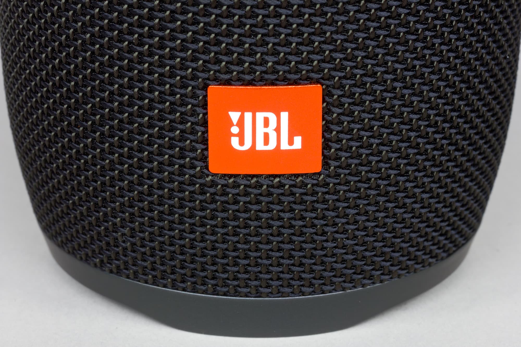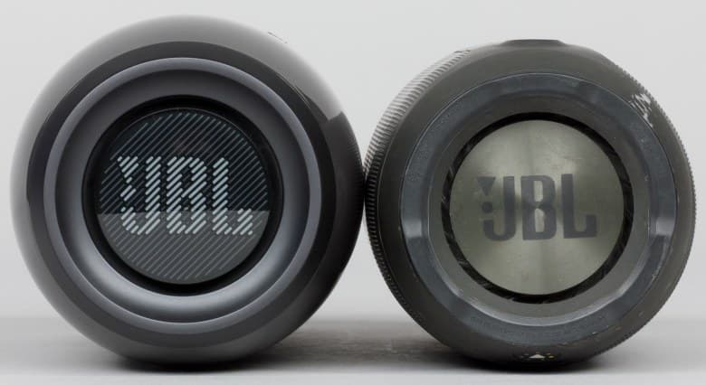 Нижняя часть колонки закрыта грилем с покрытием из ткани, напоминающей жесткий нейлон. Под ним расположены 3 разнонаправленных динамика, обеспечивающих практически 360-градусное «звуковое покрытие». Гриль не прогибается под давлением и надежно защищает динамики от механических повреждений, пыли и влаги. В центре расположен логотип «JBL».