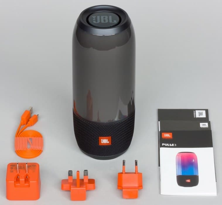 В комплекте находятся: сама колонка, зарядное устройство оранжевого цвета с откидной американской вилкой, переходники на английскую и европейские розетки, кабель Micro-USB для зарядки и руководство пользователя. Как и у прежних моделей серии, аксессуары выполнены в единой цветовой гамме и отлично подходят друг к другу.