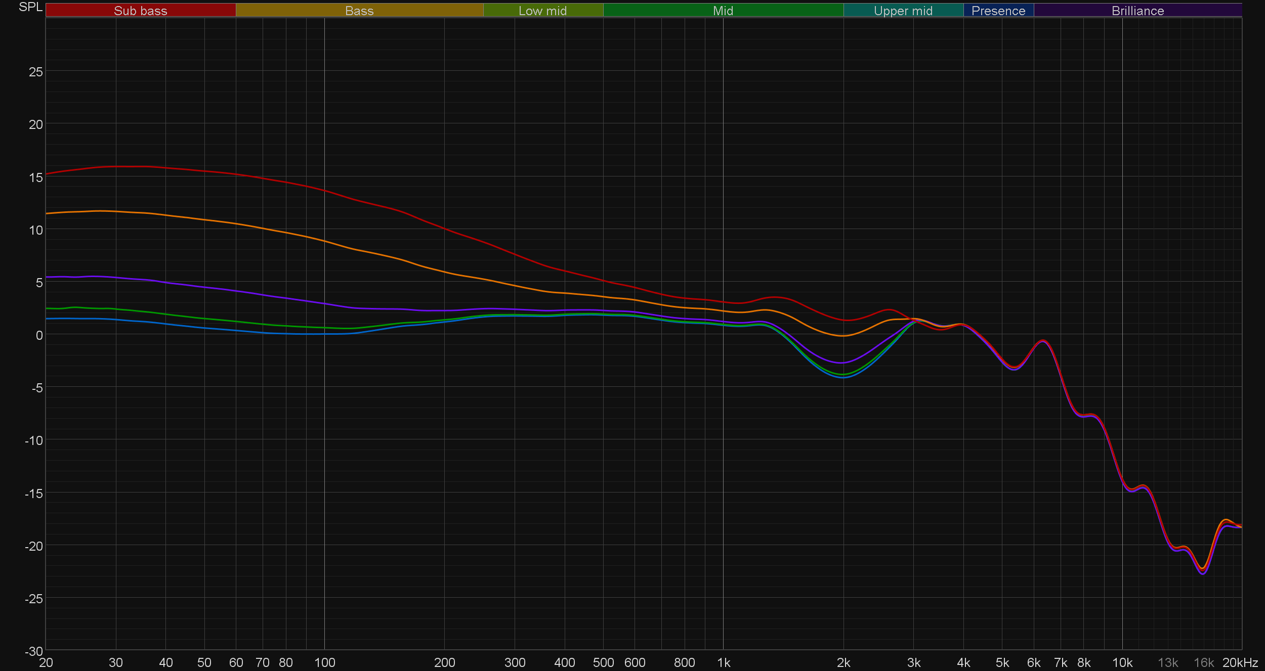 Звучание в целом довольно сбалансированное, но при этом не лишено очень ярких особенностей. Перед тем, как говорить о них, взглянем на графики АЧХ. Для начала немного поэкспериментируем с регуляторами баса — на них есть пять делений, сравним графики в каждой из позиций.