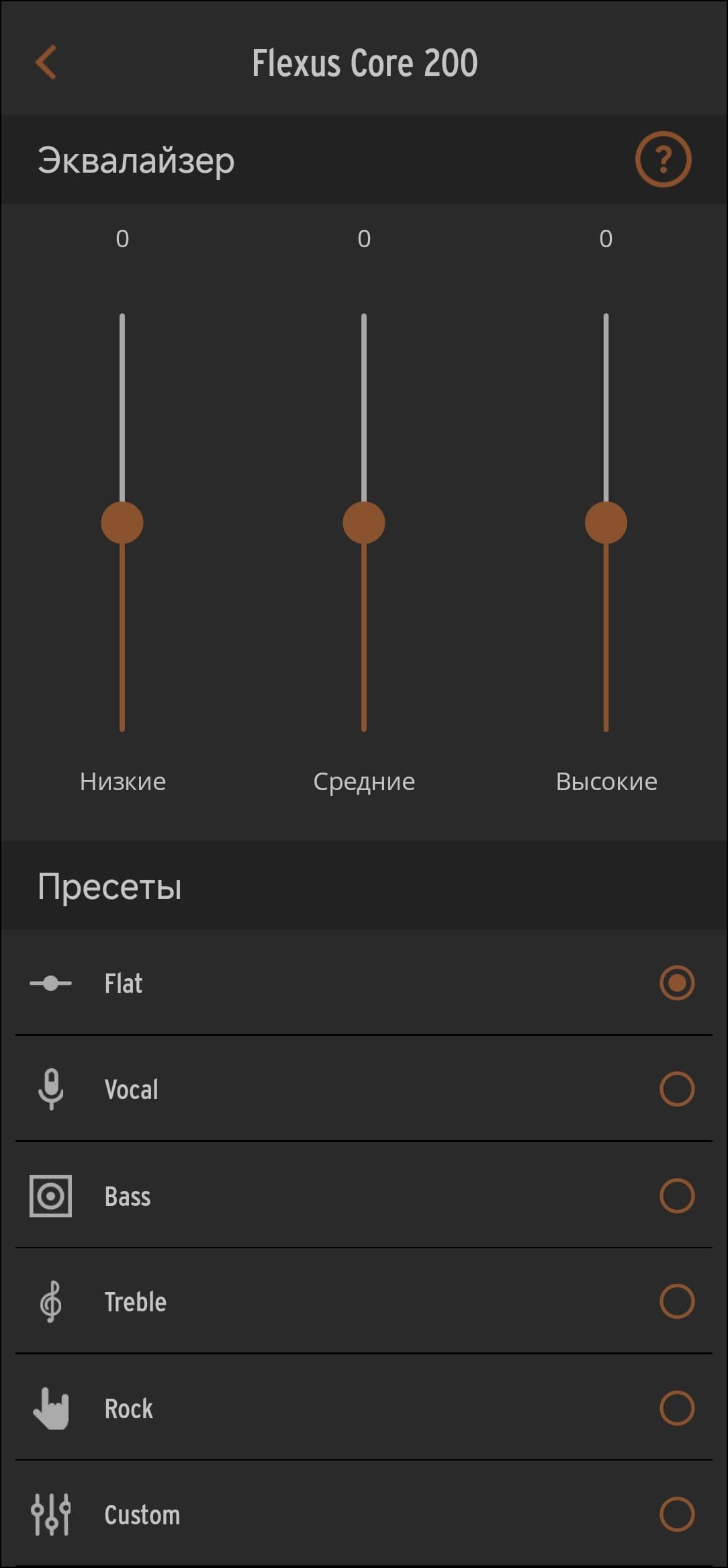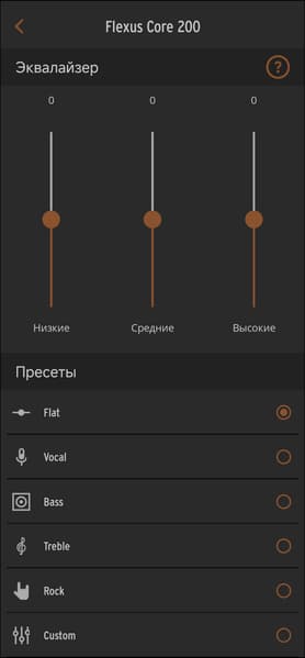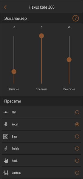 Пресеты эквалайзера делают ровно то, что ожидаешь, исходя из их названия: Vocal — выделяет середину, Bass — НЧ-диапазон, Treble — высокие. Ну а Rock поднимает края диапазона — почему-то очень многие производители считают, что именно так нужно слушать рок-музыку.