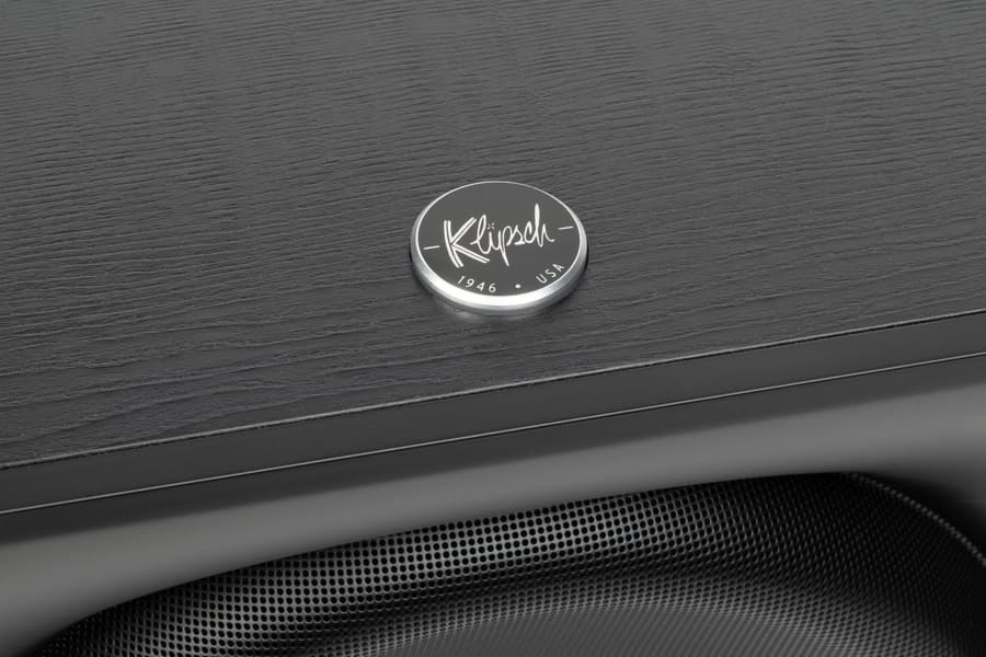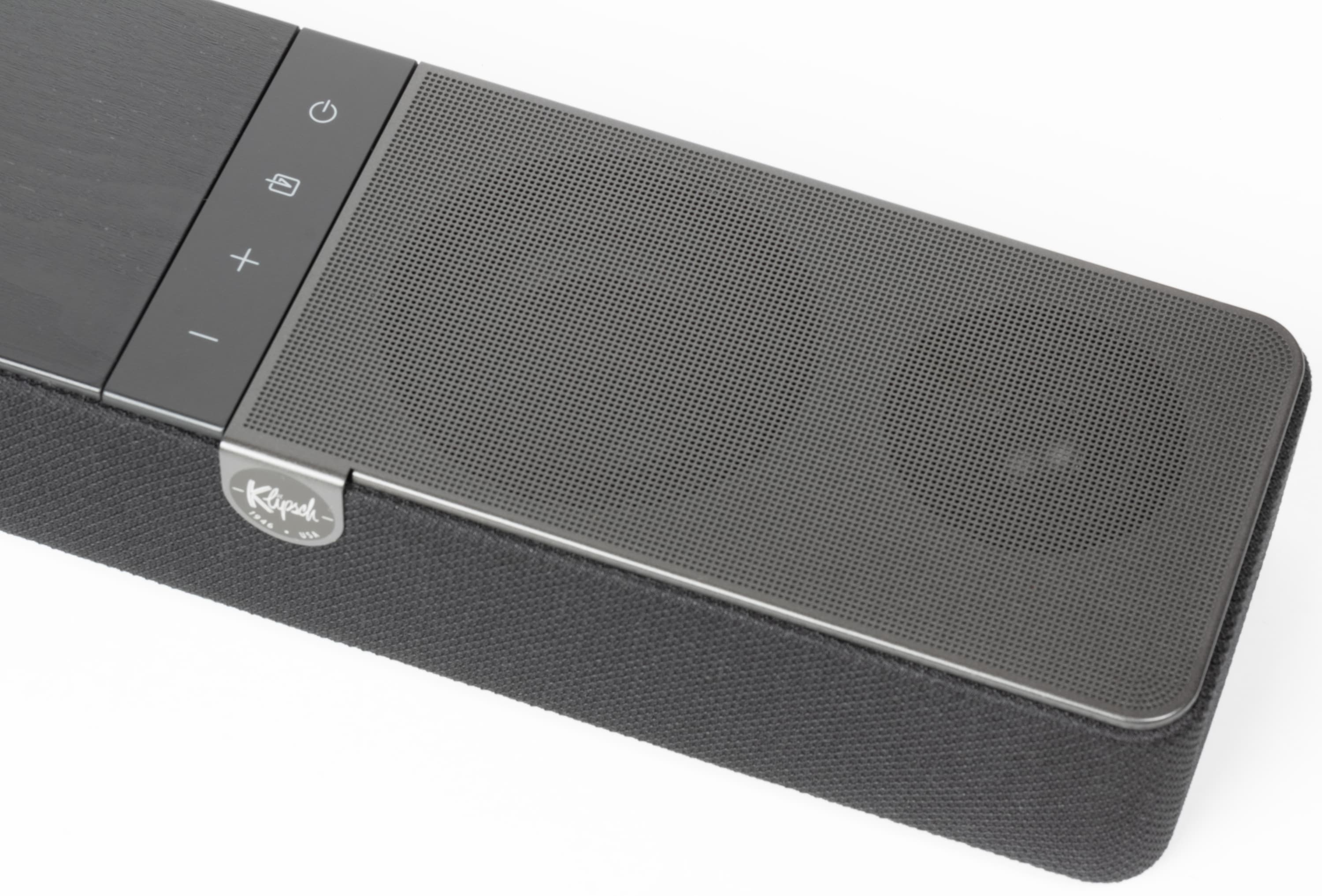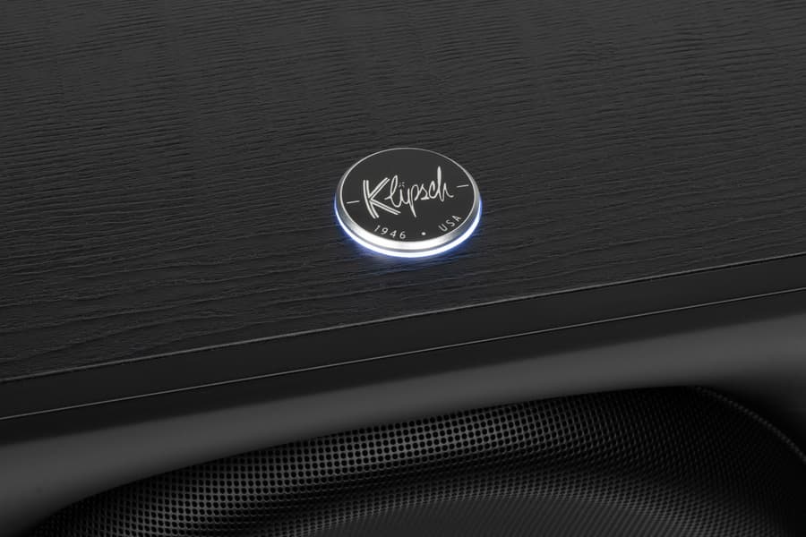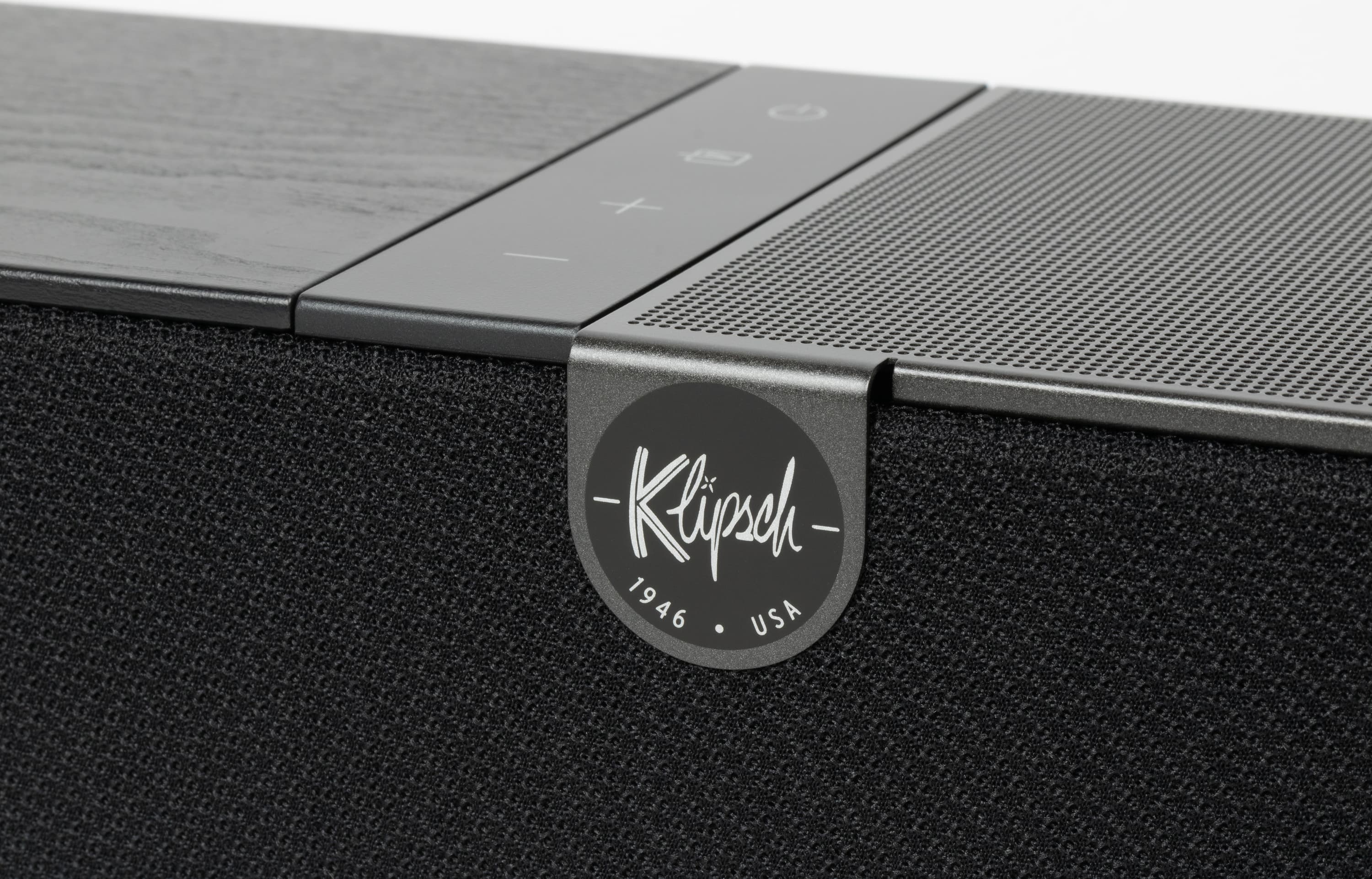Ближе к правому верхнему углу расположен единственный декоративный элемент — логотип Klipsch. На верхней панели рядом с ним находится небольшая сенсорная панель управления.