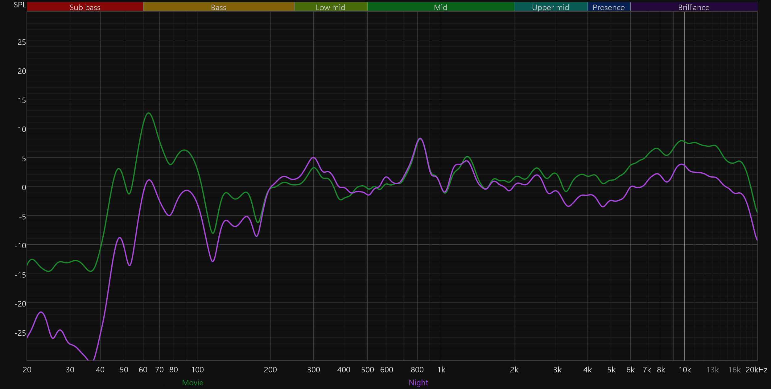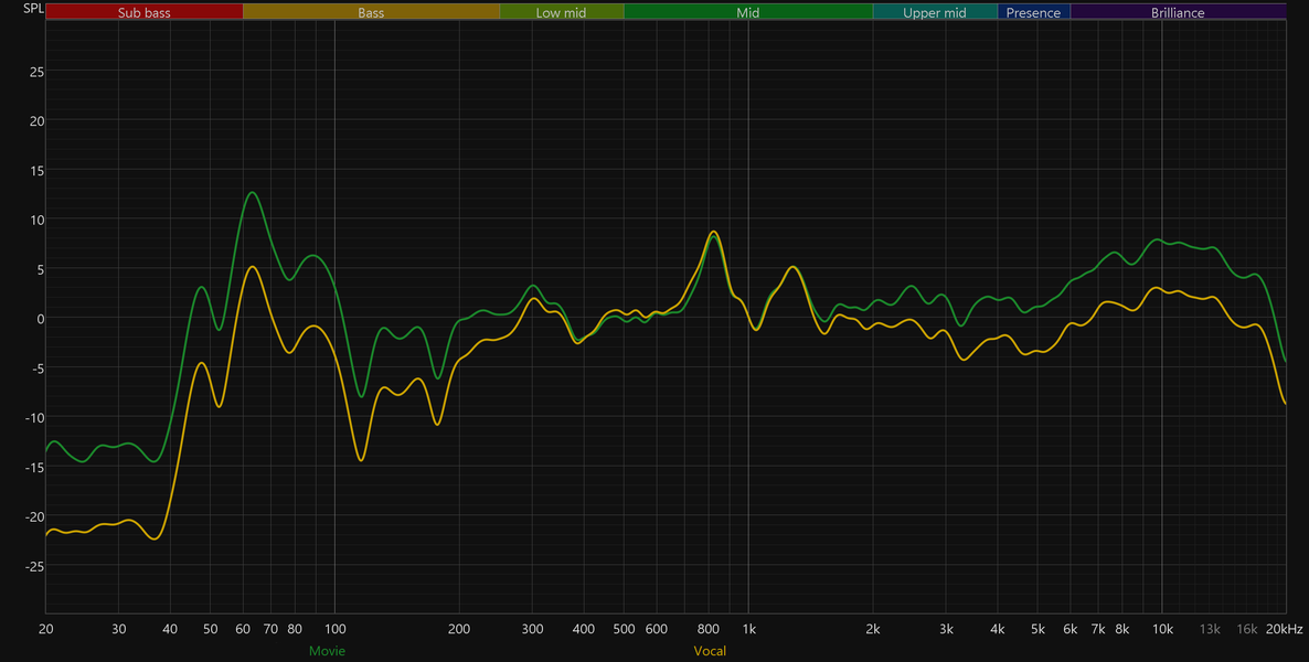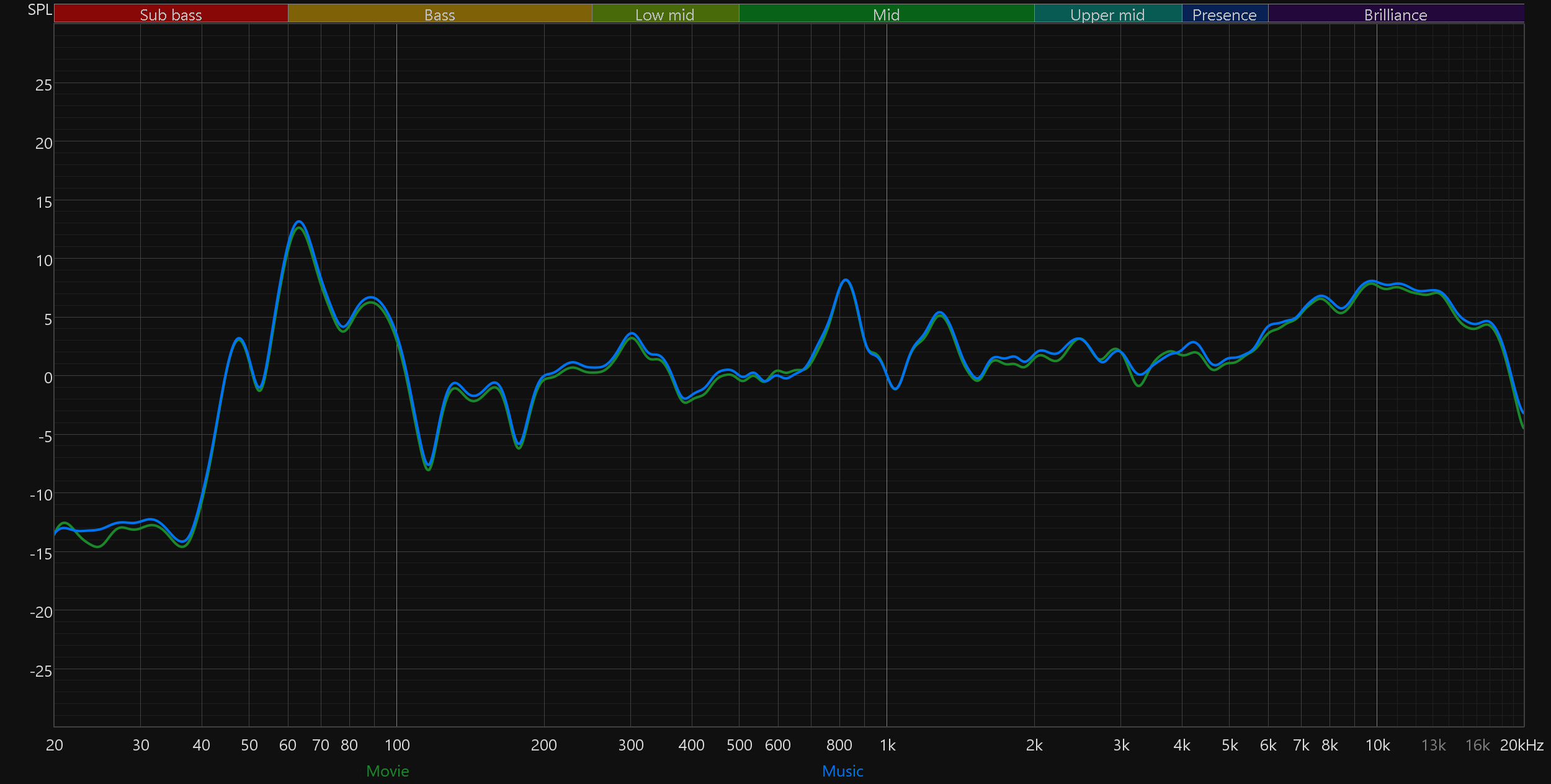 Переключение режимов «Музыка» и «Фильм» почти не влияет на тональный баланс — настраивают они, по всей видимости, уровни громкости каналов и добавляемую задержку звука для создания эффекта окружающего звука. В режиме «Музыка» акцент делается на стереозвучание и расширение так называемой «виртуальной сцены», в режиме «Фильм» — на более яркое восприятие «движения» звуковых эффектов вокруг слушателя.