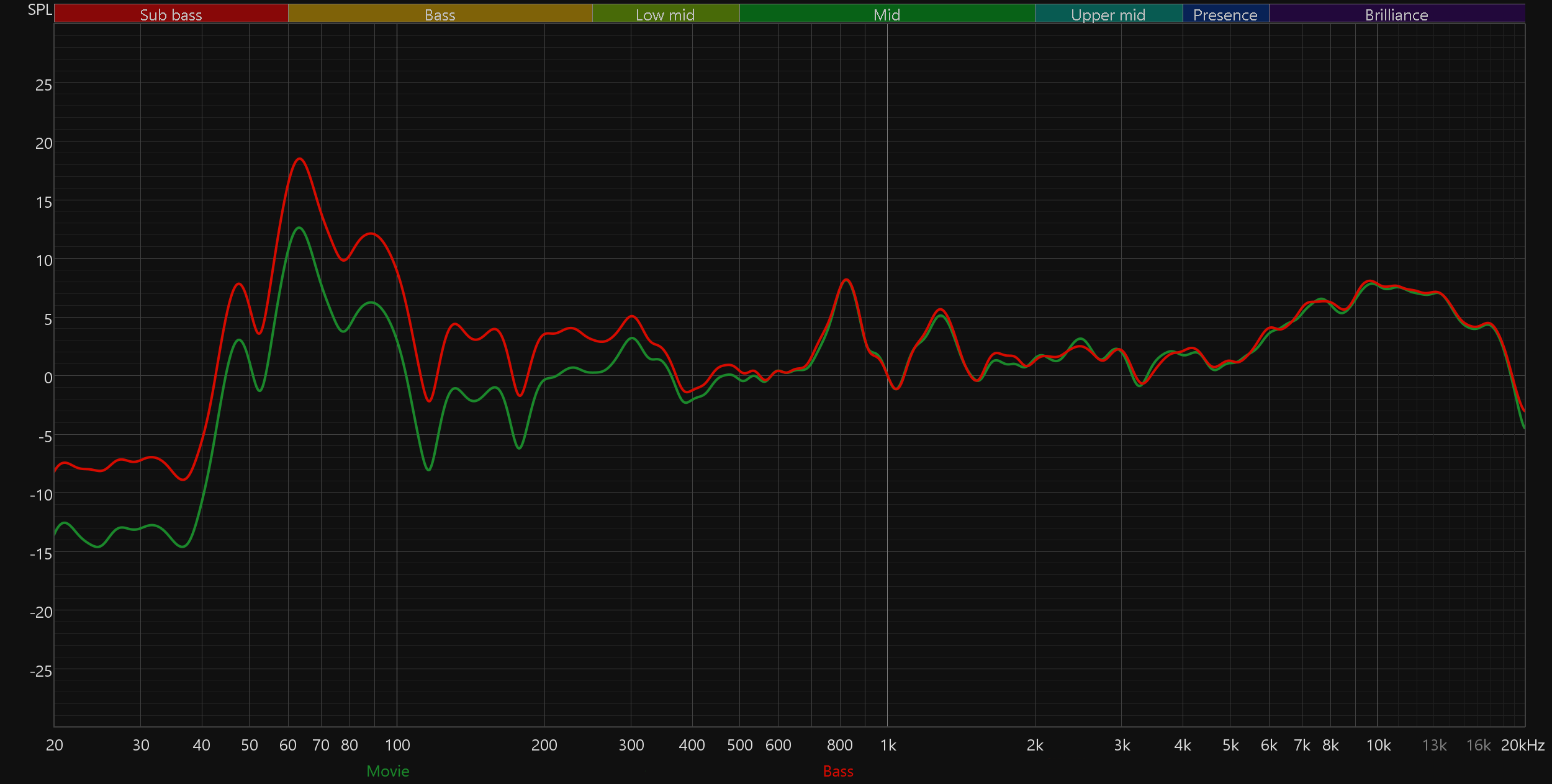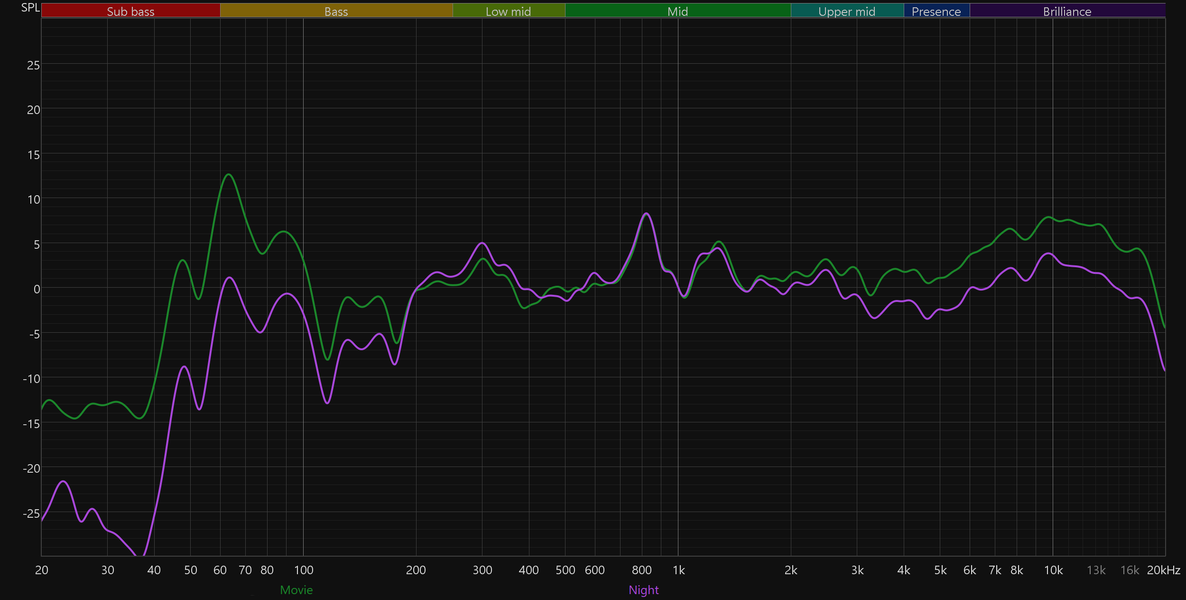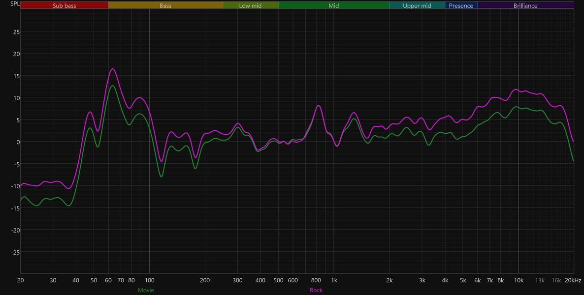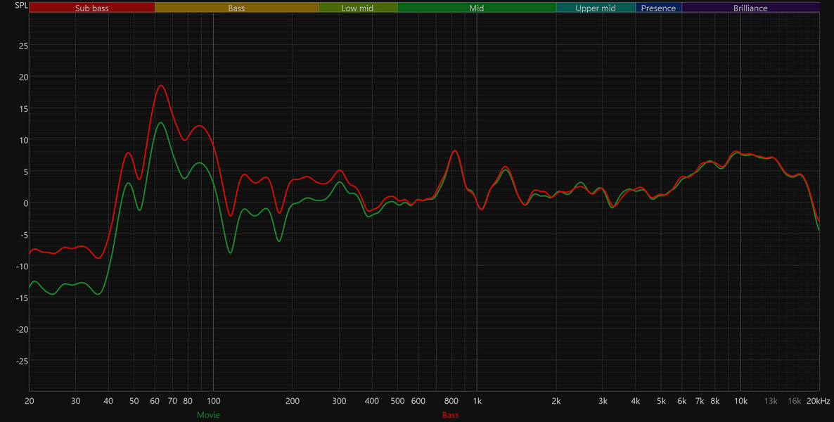 Переключение режимов «Музыка» и «Фильм» почти не влияет на тональный баланс — настраивают они, по всей видимости, уровни громкости каналов и добавляемую задержку звука для создания эффекта окружающего звука. В режиме «Музыка» акцент делается на стереозвучание и расширение так называемой «виртуальной сцены», в режиме «Фильм» — на более яркое восприятие «движения» звуковых эффектов вокруг слушателя.