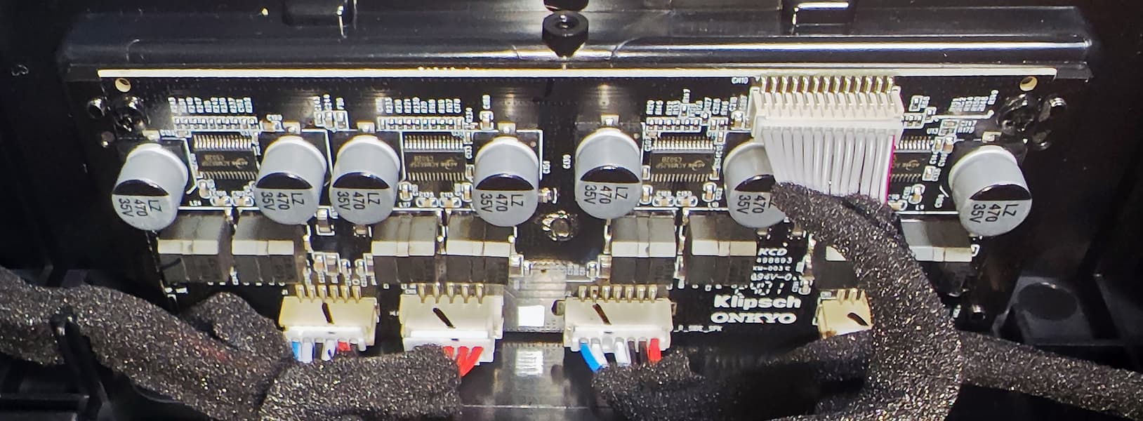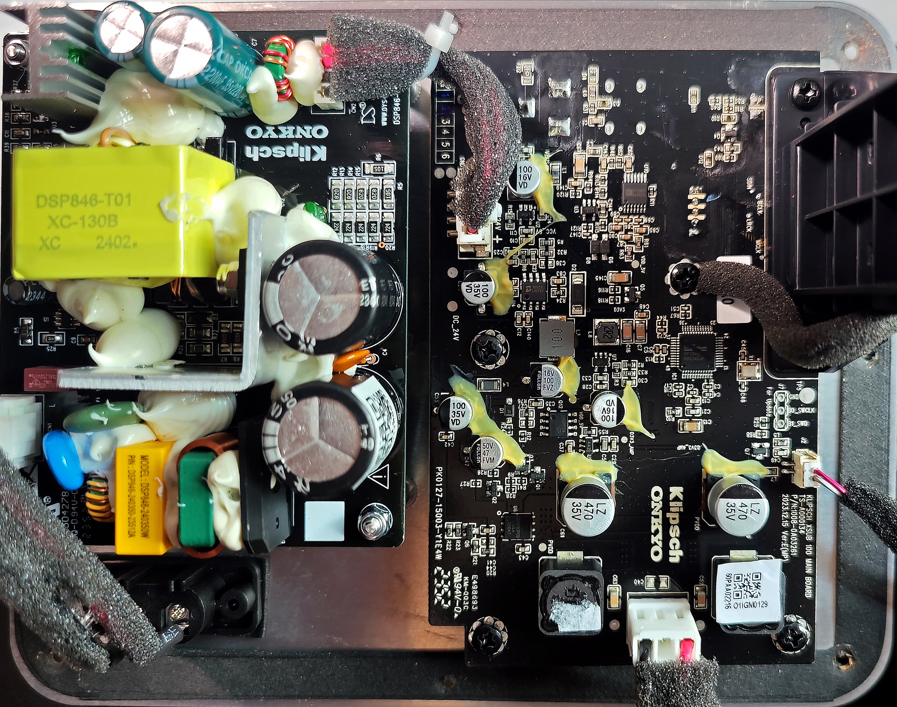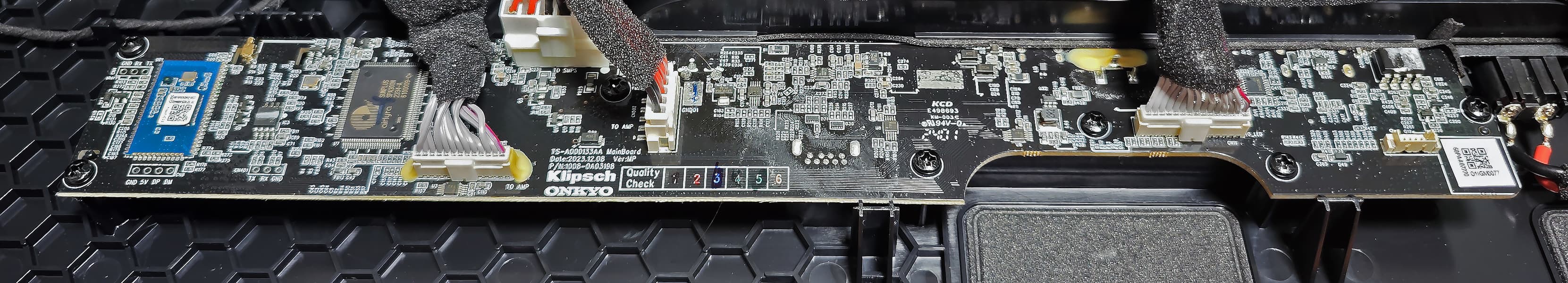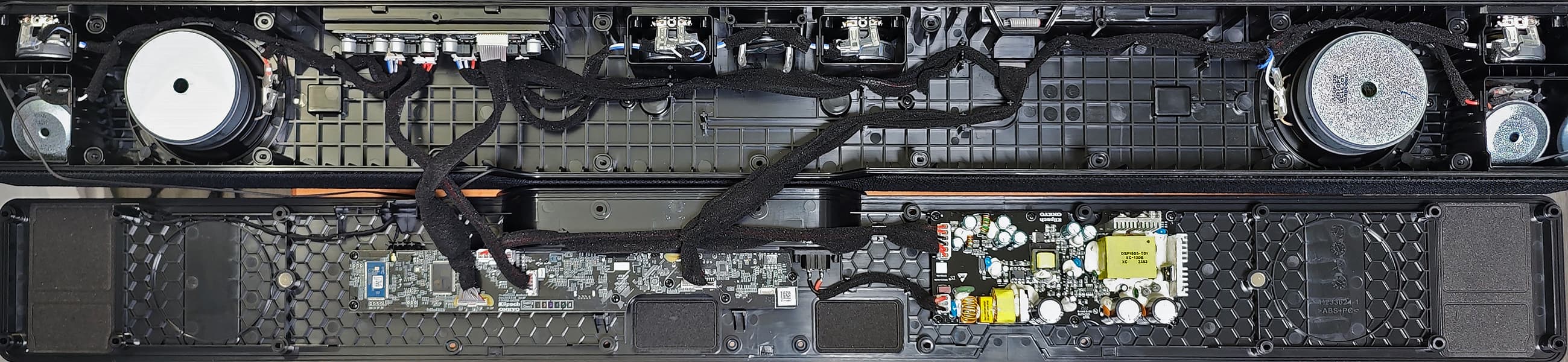 Самая большая плата содержит «мозги» саундбара, закреплена она задней стенке. Все части устройства соединены шлейфами, которые при необходимости можно отключить, кабели закрыты тонким слоем звукоизолирующего материала.