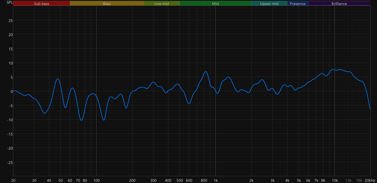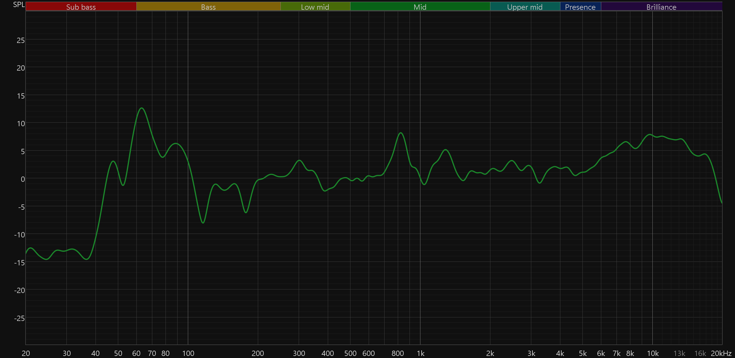 Для начала посмотрим на АЧХ самого саундбара. Первое, что бросается в глаза — это полновесный бас, на котором еще и сделан значительный акцент. Конечно, «бить в грудь» и сотрясать комнату он не будет, но нехватки низкочастотного диапазона тут нет. Середина подается пусть и не идеально «ровно», но без заметных дефектов и даже с приемлемым уровнем детализации, ВЧ-диапазон немного форсирован, что повышает субъективно воспринимаемое «качество» звучания, но не приводит к появлению так называемого «песка» — в случае с саундбарами такие «уловки» в настройке вполне уместны.
