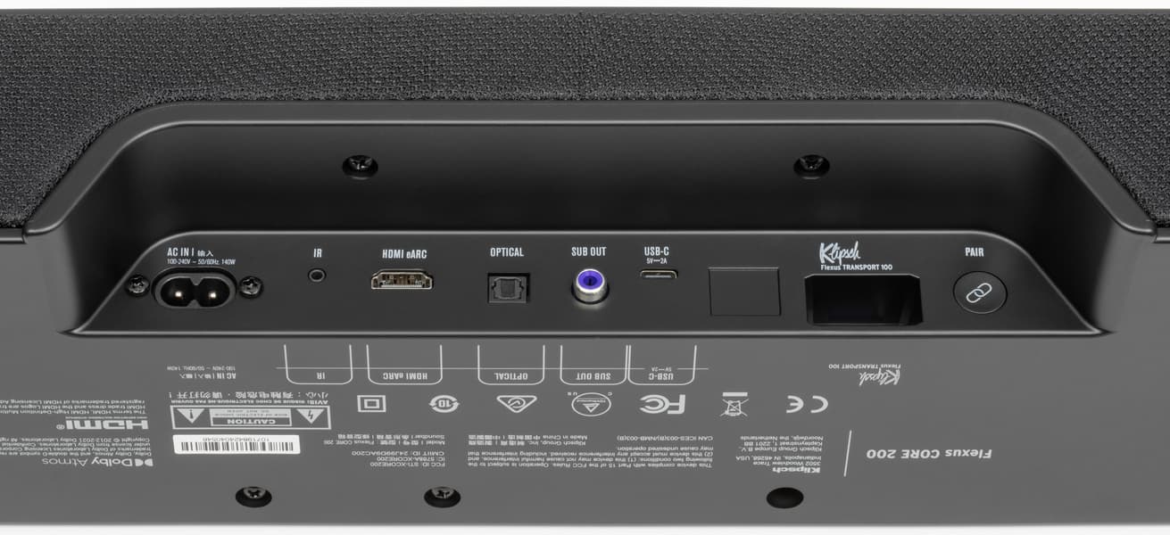 Klipsch Flexus Core 100 — «младший» саундбар в линейке шириной чуть более 70 см, имитирующий звучание формата 2.1. Для этого в нем размещены два фронтальных динамика диаметром 2,25 дюйма с алюминиевым конусом, плюс еще два диаметром 4 дюйма, ответственные за низкие частоты. Для подключения источников предусмотрены порт HDMI eARC, цифровой оптический вход, разъем USB-C и адаптер Bluetooth. Поддерживается декодирование различных вариантов Dolby — от Dolby Digital до Dolby Atmos, а вот поддержки DTS нет. Управление устройством возможно с помощью клавиш на корпусе, пульта ДУ или приложения Klipsch Connect Plus для гаджетов под управлением iOS и Android, которое предлагает доступ к различным настройка, в частности — встроенному эквалайзеру. Стоимость на момент тестирования — около 45 тысяч рублей.