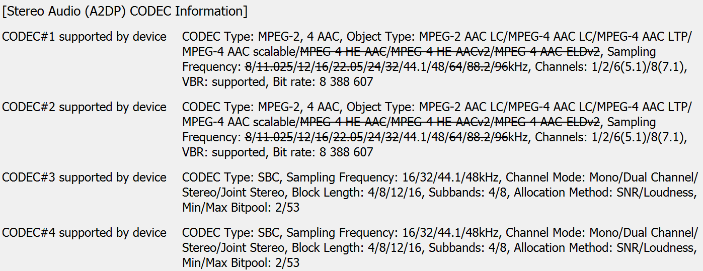 Полный список поддерживаемых кодеков и их режимов мы традиционно получили с помощью утилиты Bluetooth Tweaker. Поддерживаются два основных на сегодняшний день варианта: базовый SBC и несколько более «продвинутый» AAC.