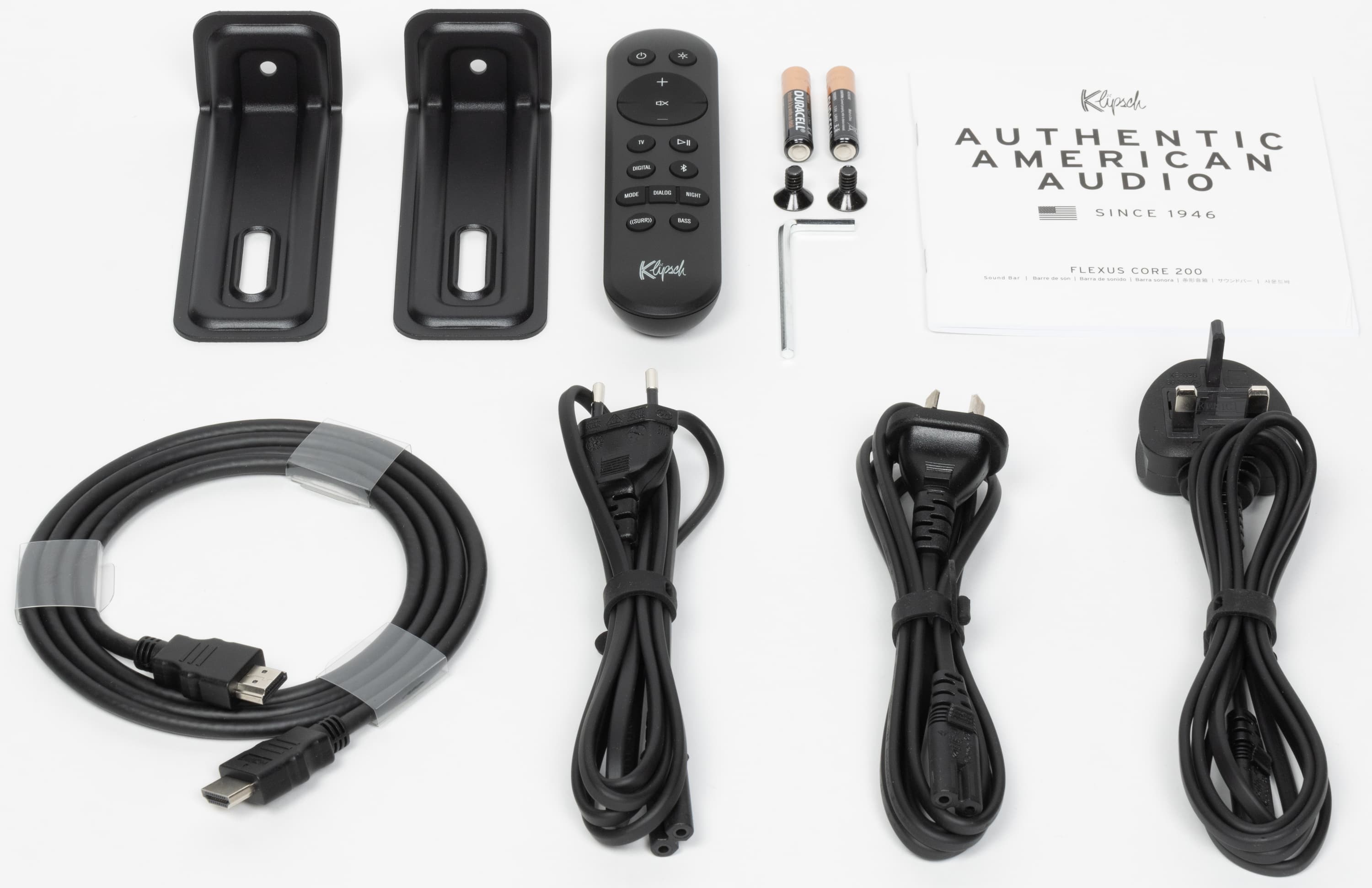 В комплект поставки Klipsch Flexus Core 200 входят сам саундбар, кронштейны для настенной установки, инструкция, ПДУ с батарейками, HDMI-кабель длиной 1,5 м. Плюс кабели питания — производитель поставляет сразу три их варианта под розетки разных стандартов.