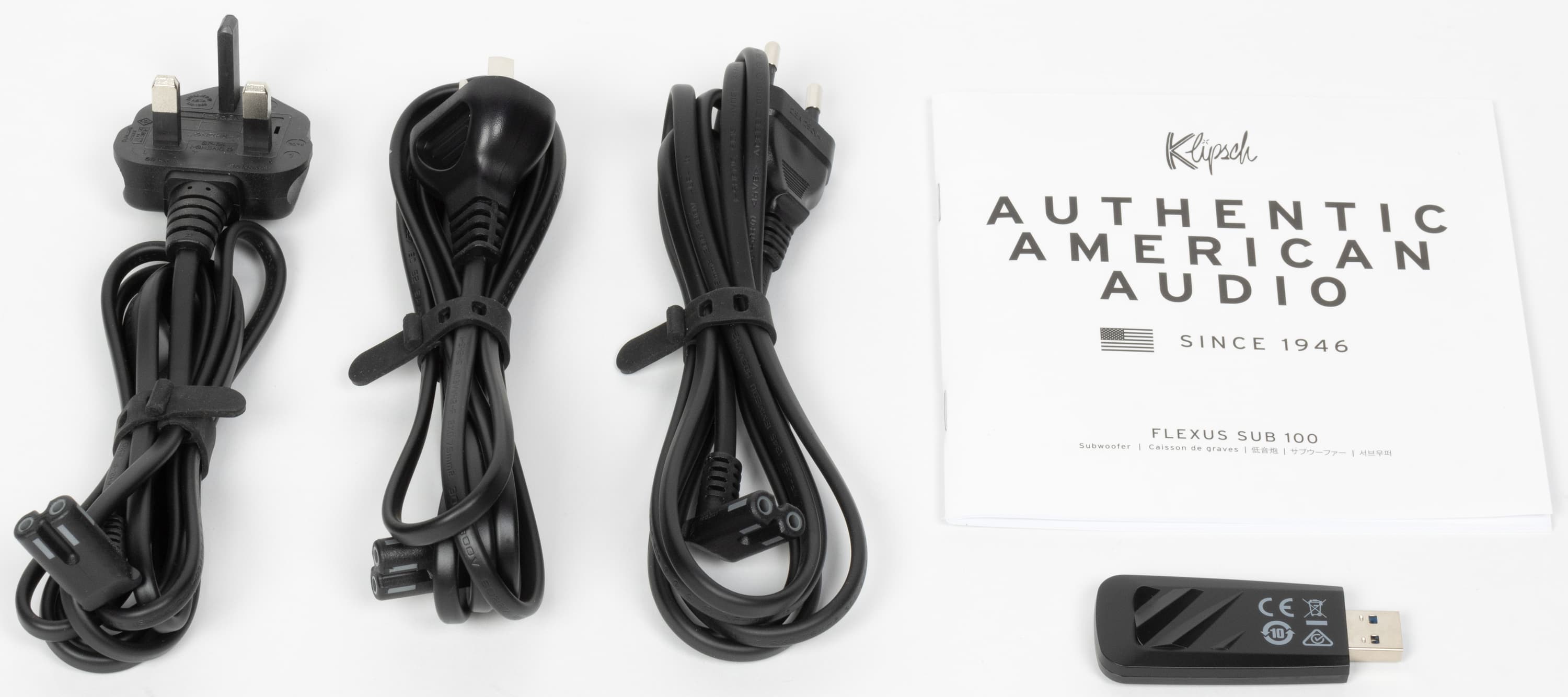 У сабвуфера в комплекте также три кабеля питания, инструкция и адаптер для беспроводного подключения с коннектором USB-A.
