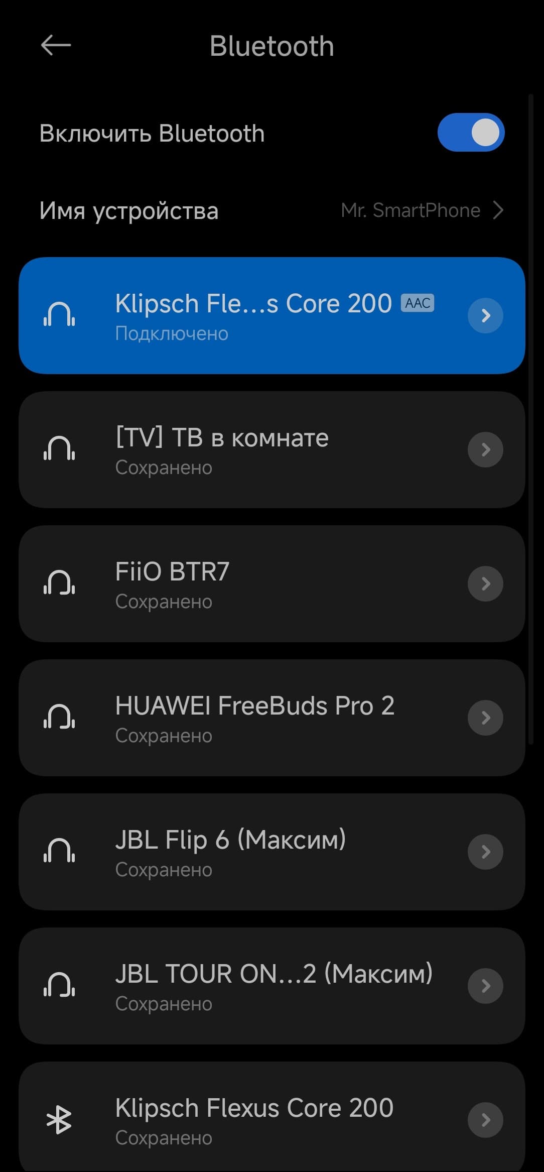 В основном для трансляции аудиоконтента с внешних источников, конечно же, будут использоваться мобильные гаджеты, подключенные посредством Bluetooth. После запуска Bluetooth-подключения Klipsch Flexus Core 200 некоторое время пытается соединиться с уже «знакомыми» устройствами, если не получается — переходит в режим сопряжения. Остается найти его в соответствующем меню используемого смартфона и подключить.