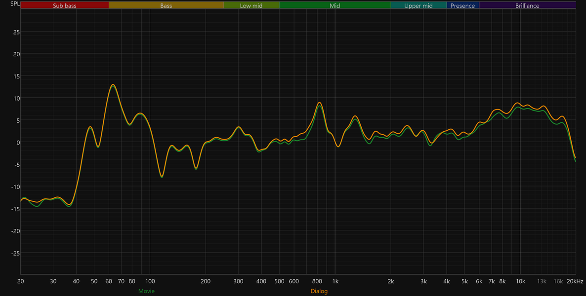 Режим «Диалог» тоже не оказывает заметного влияния на АЧХ — по ощущениям, он просто немного поднимает громкость центрального канала, где эти самые диалоги обычно и находятся. Ну и, возможно, чуть акцентирует середину опять-таки в центральном канале — на общий тональный баланс это влияет мало, а разговоры становятся более читаемыми.