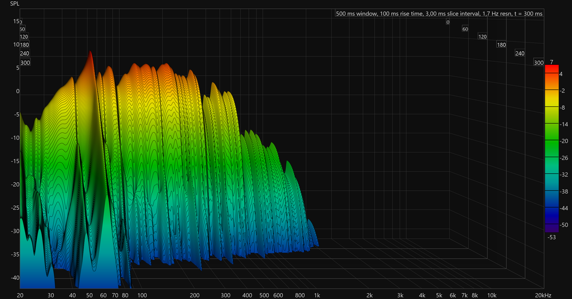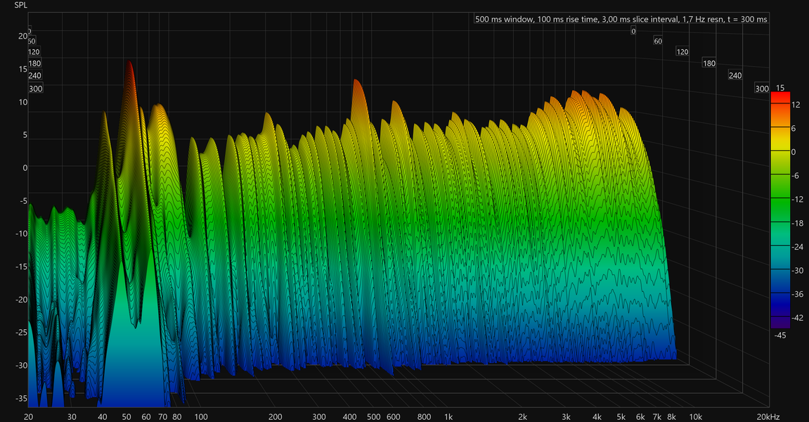 Выполнен сабвуфер в формате «закрытого ящика», но за счет резонансов внутри корпуса всё же заметно «гудит». Правда, пики на «водопаде» в данном случае выглядят сравнительно скромно.