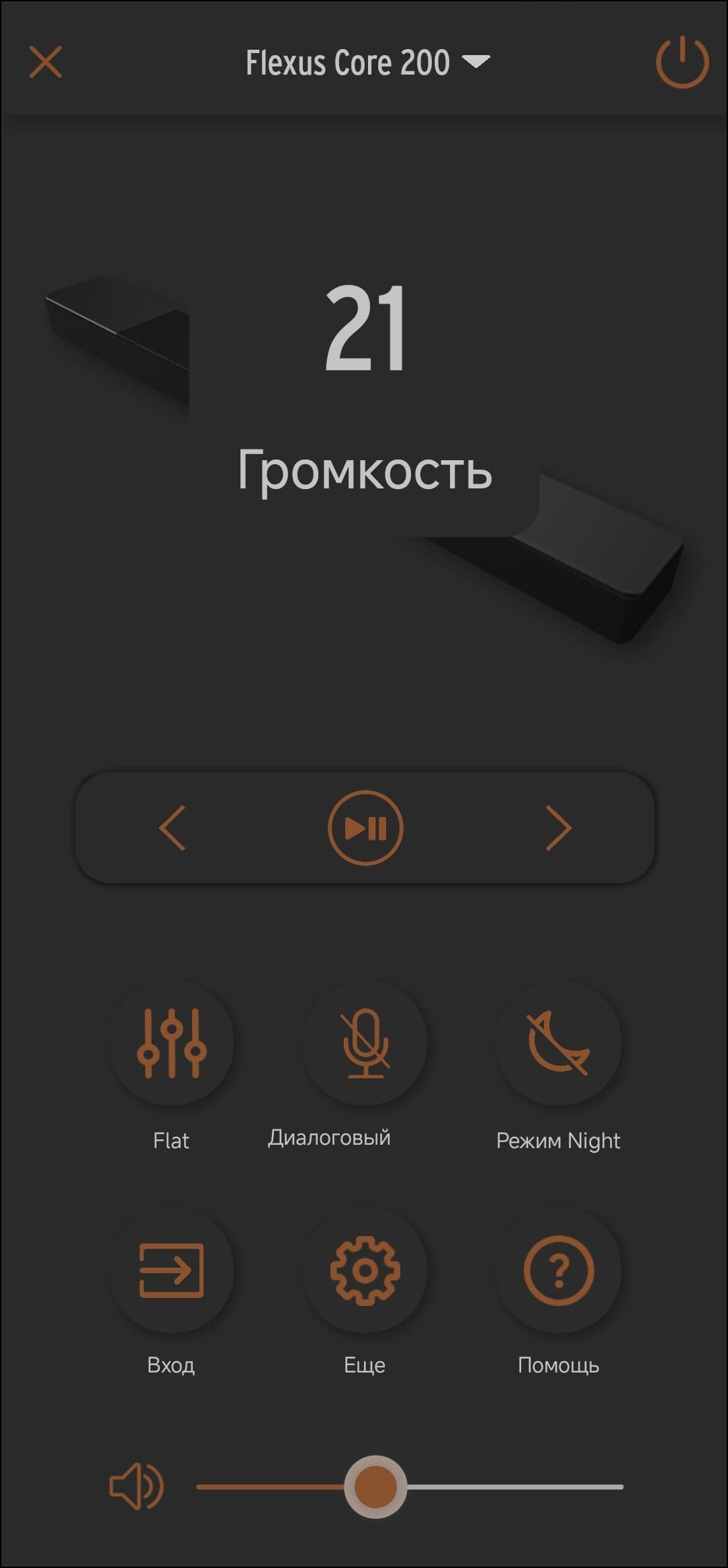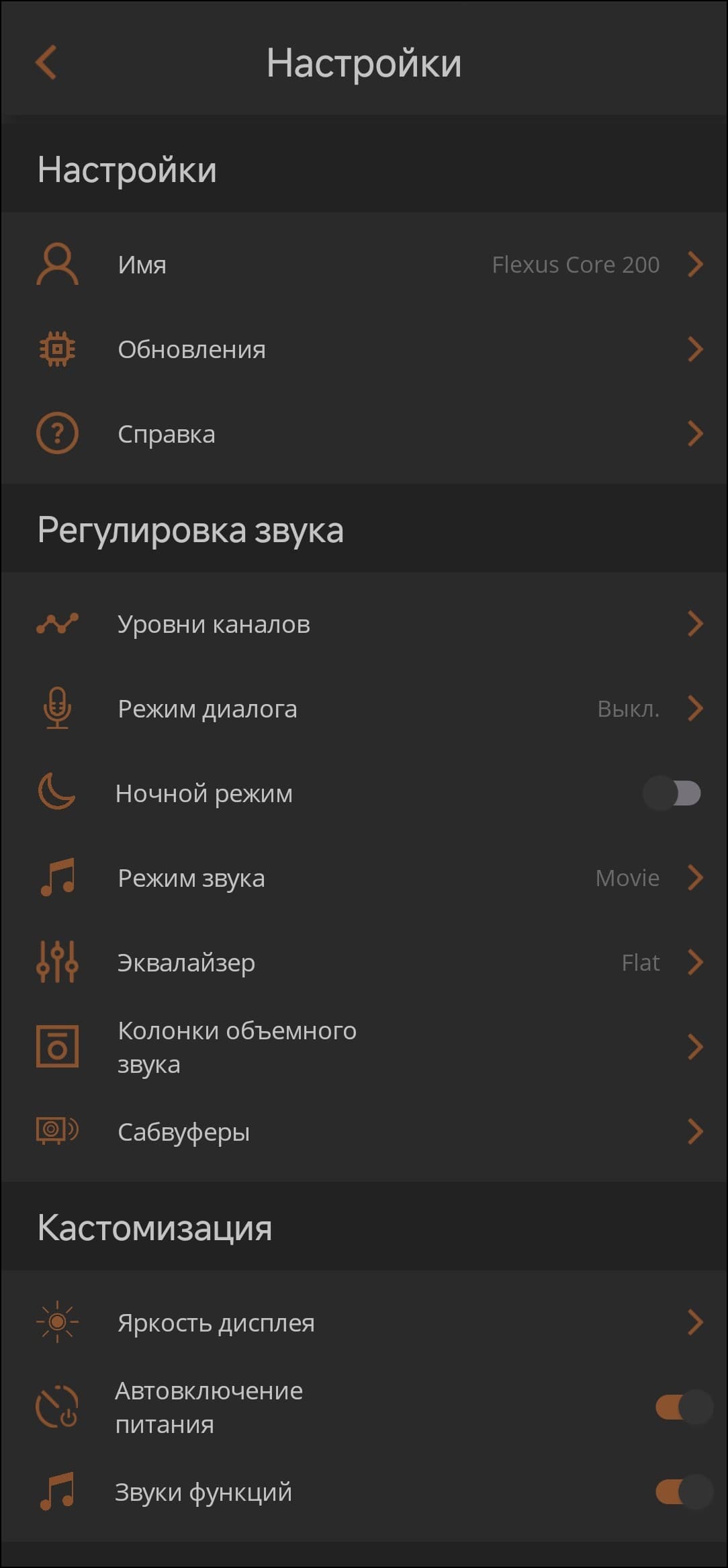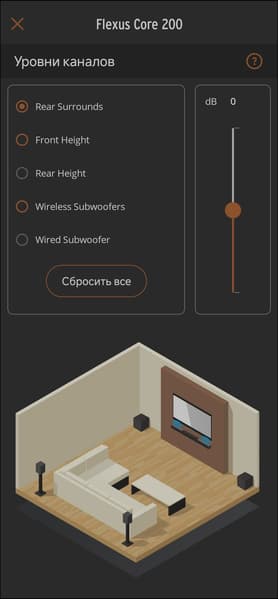 Вероятнее всего, какая-нибудь система автонастройки звука под помещение сделала бы объемное звучание еще более впечатляющим, но ее в Klipsch Flexus Core 200 нет. Придется всё брать в свои руки: ставить приложение и настраивать громкость всех каналов, пытаясь добиться сбалансированного их звучания. Можно использовать специальный «тестовый контент» или просто знакомые фильмы. Потребуется некоторое время на эксперименты, но результат потенциально может быть очень хорошим — в конце концов, задачи сделать всё идеально тут нет, лишь бы было интересно и комфортно слушателям. Настроек у Klipsch Flexus Core 200 множество, посмотреть на его работу во всех их сочетаниях не представляется возможным, так что сконцентрируемся на основных.