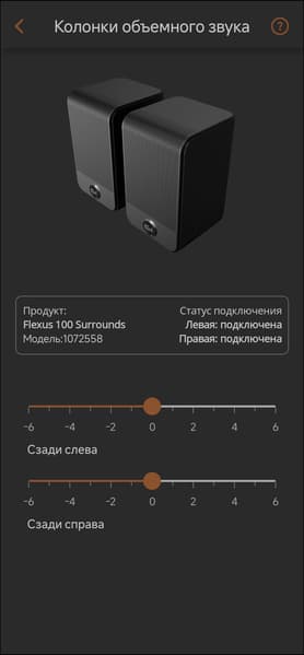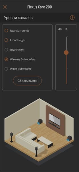 Громкость каждого из устройств в системе можно настроить отдельно, что позволит адаптировать ее под особенности помещения и положение слушателей. Измерительного микрофона в комплекте и системы автонастройки нет — немного жаль, об этом мы еще поговорим чуть ниже. Также из общего меню доступны еще два режима звучания: «фильм» и «музыка».