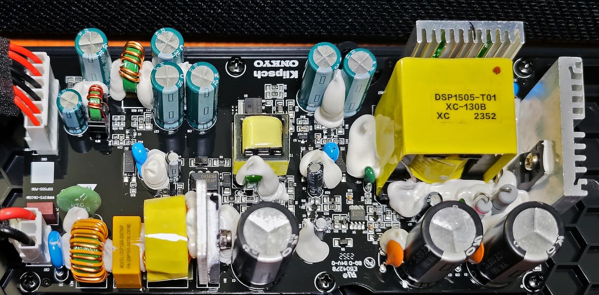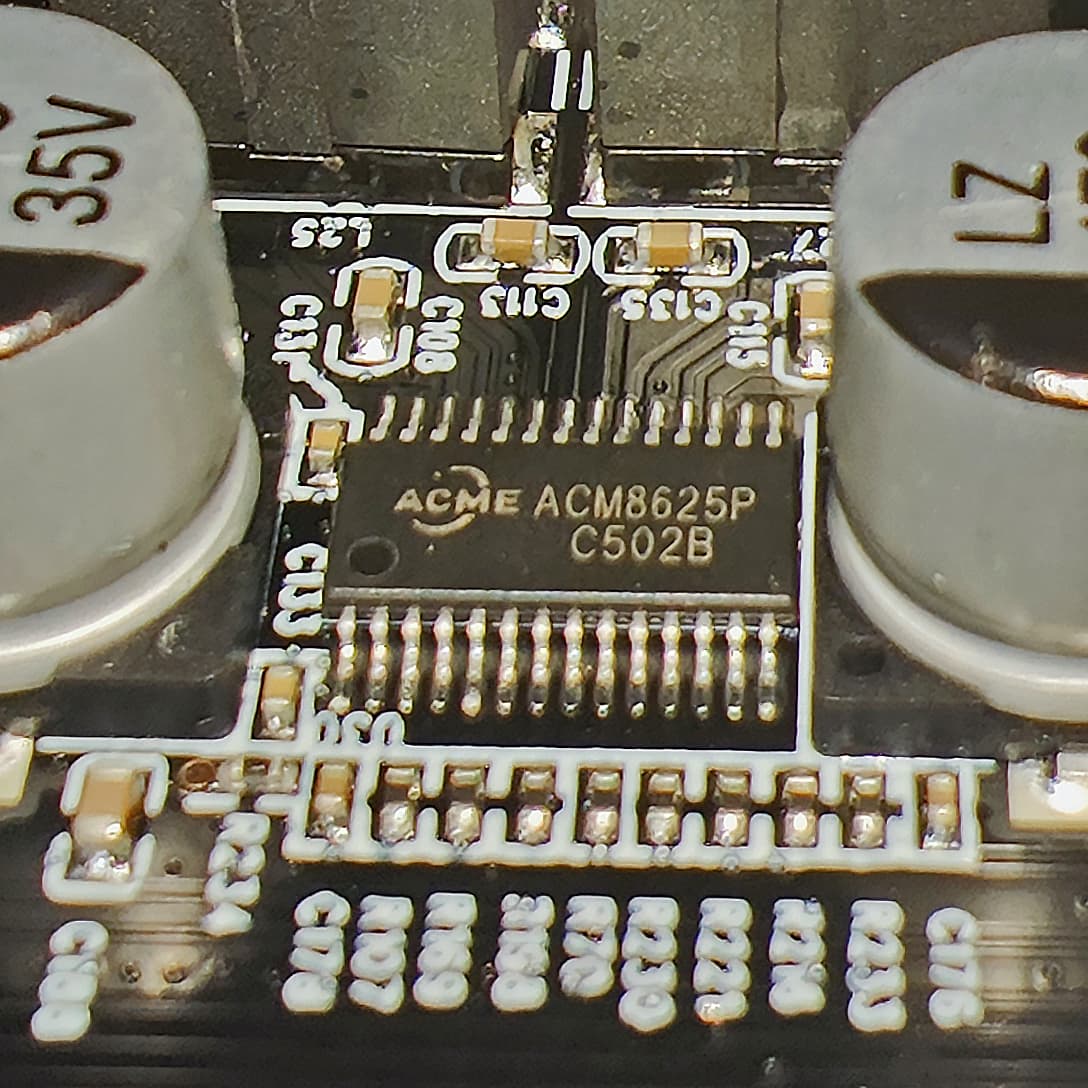 Усиление построено на четырех усилителях класса D с цифровым входом Acme ACM8625, каждый из которых способен выдавать до 26 Вт при нагрузке 8 Ом.