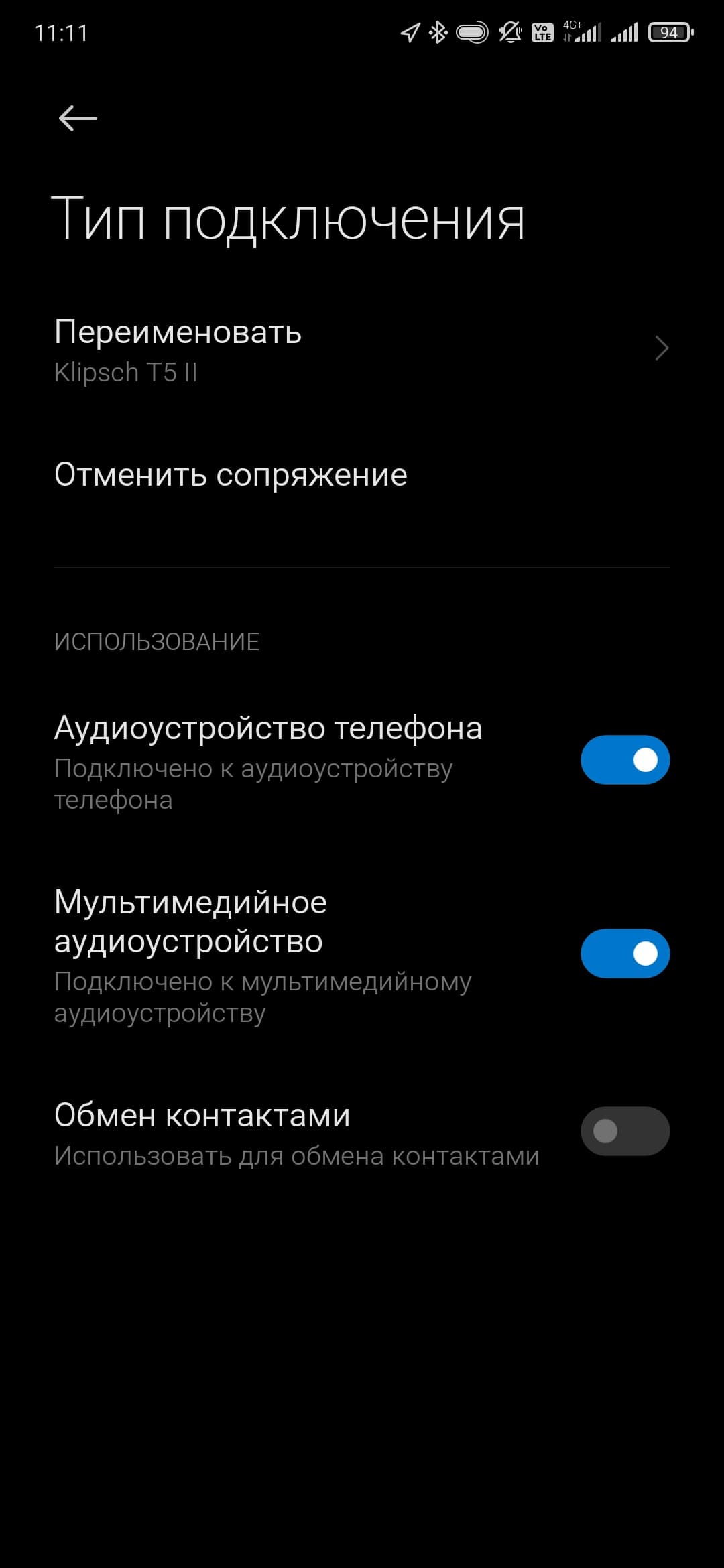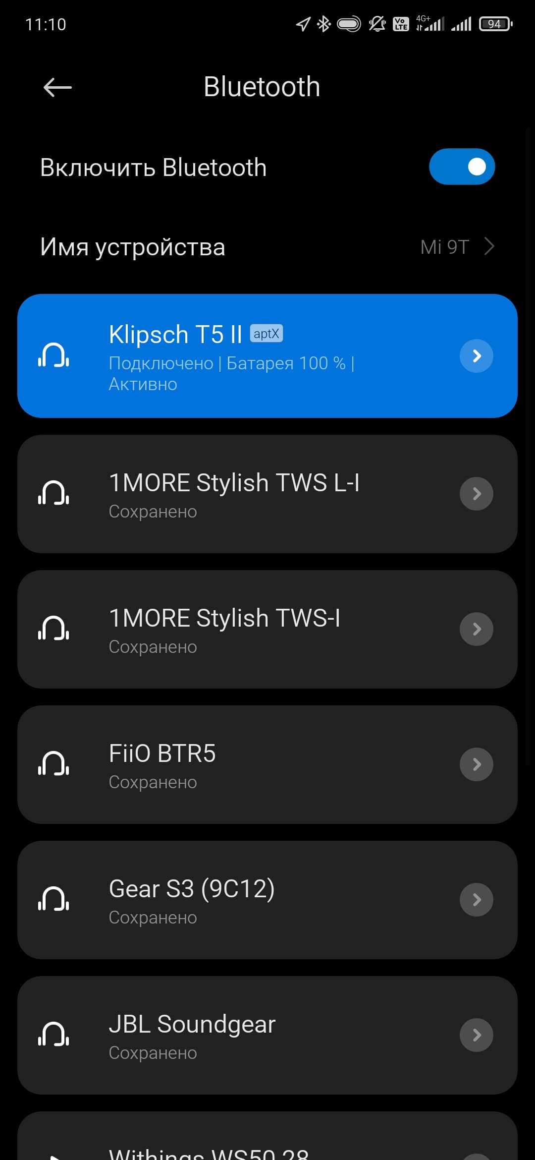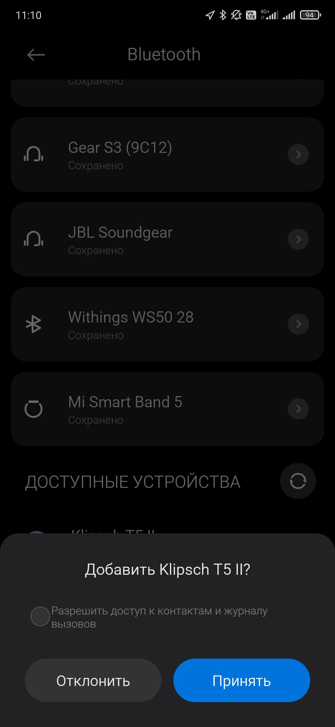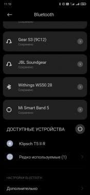 После извлечения из кейса гарнитура несколько секунд пытается подключиться к последнему использовавшемуся источнику, если не получается — активирует режим сопряжения. Если вдруг этого не произошло, можно принудительно запустить процесс, удерживая нажатыми кнопки на обоих наушниках в течение 3 секунд. Далее все как обычно: находим Klipsch T5 II в соответствующем меню гаджета, кликаем, соглашаемся, подключаем…