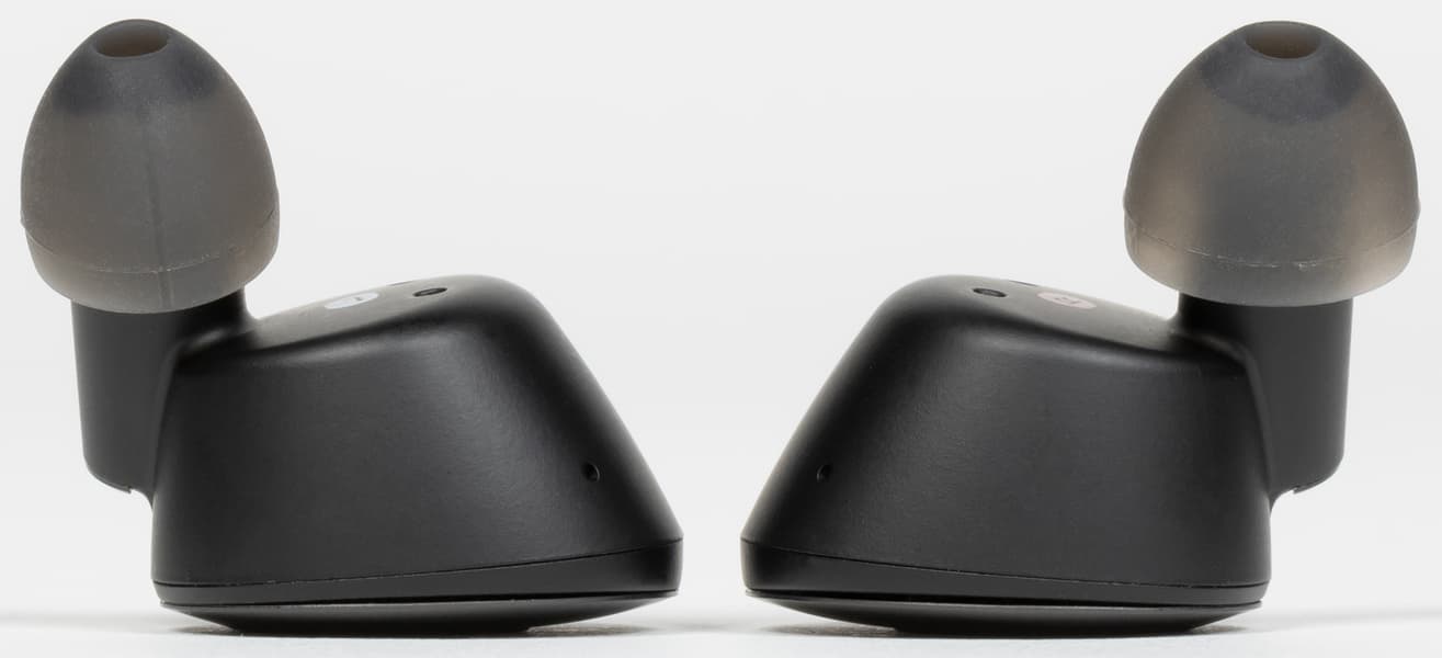 Звуководы расположены как бы сверху над корпусом и выходят из него под сравнительно большим углом. Рядом с ними виднеются отверстия, за которыми скрываются микрофоны, обеспечивающие работу функции «звуковой прозрачности».
