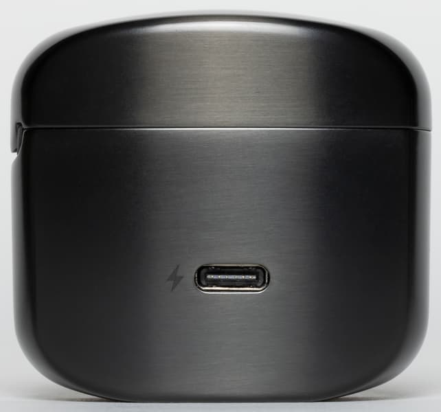 На переднюю панель зарядного кейса нанесен логотип производителя. Он не слишком выделяется на общем фоне и не привлекает к себе лишнего внимания, смотрится очень стильно. Крышка прилегает к корпусу хорошо и без лишних зазоров. Имеется небольшой люфт, но при повседневном использовании он особо не заметен и вряд ли влияет на надежность и долговечность футляра.
