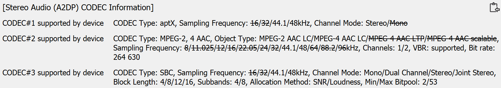 С устройствами под управлением Android используется «продвинутый» кодек aptX, обладателям «яблочных» девайсов предлагается привычный им AAC. Ну и, конечно, есть базовый SBC — куда без него. Полный список поддерживаемых кодеков и их режимов мы традиционно получили с помощью утилиты Bluetooth Tweaker.