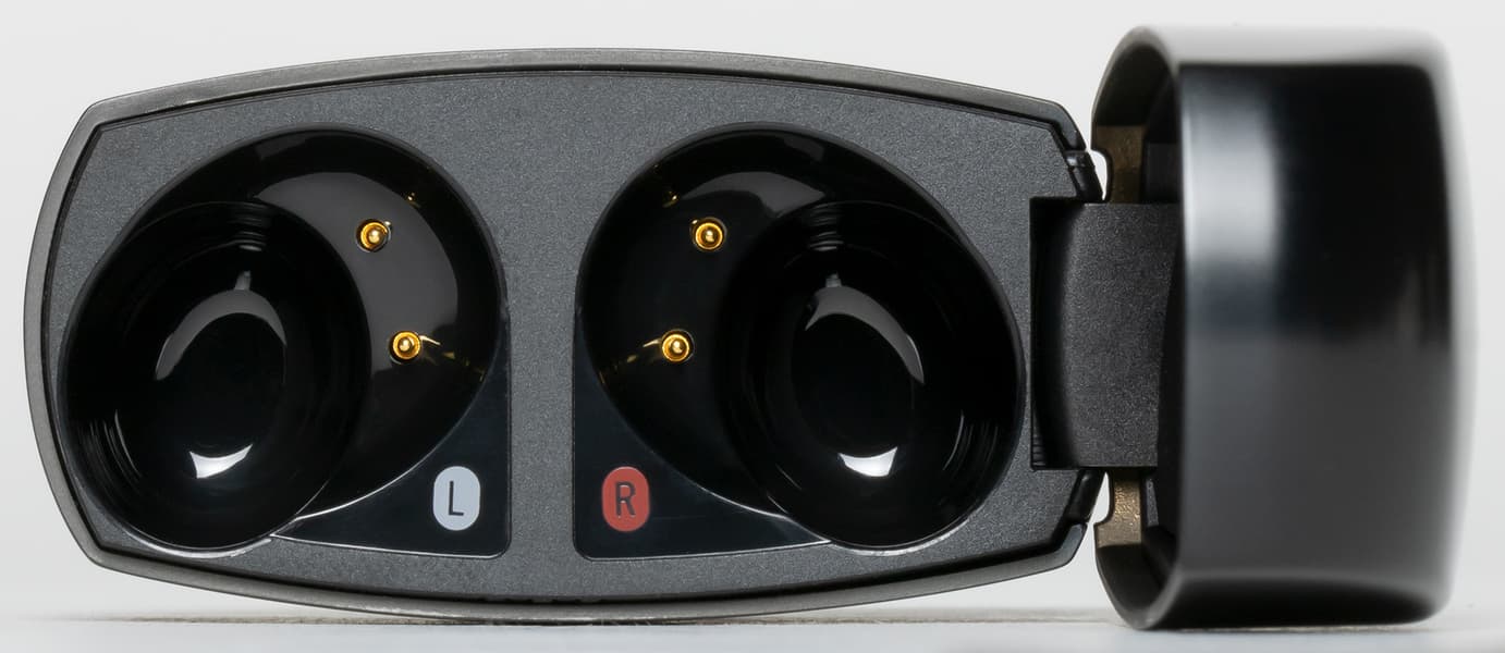 Слоты для правого и левого наушника имеют свои обозначения, внутри каждого видны подпружиненные контакты для зарядки, которые в случае необходимости можно легко очистить — расположены они для этого максимально удобно. Периодически возникает ощущение, что контакт не самый надежный, стоит немного пошевелить наушники во время зарядки, как индикаторы на них гаснут. Но при закрытой крышке они более плотно прижимаются к контактам и заряжаются вполне корректно. Единственный нюанс — в случае глубокого разряда индикатор может загораться красным не сразу, а только после примерно получаса зарядки.