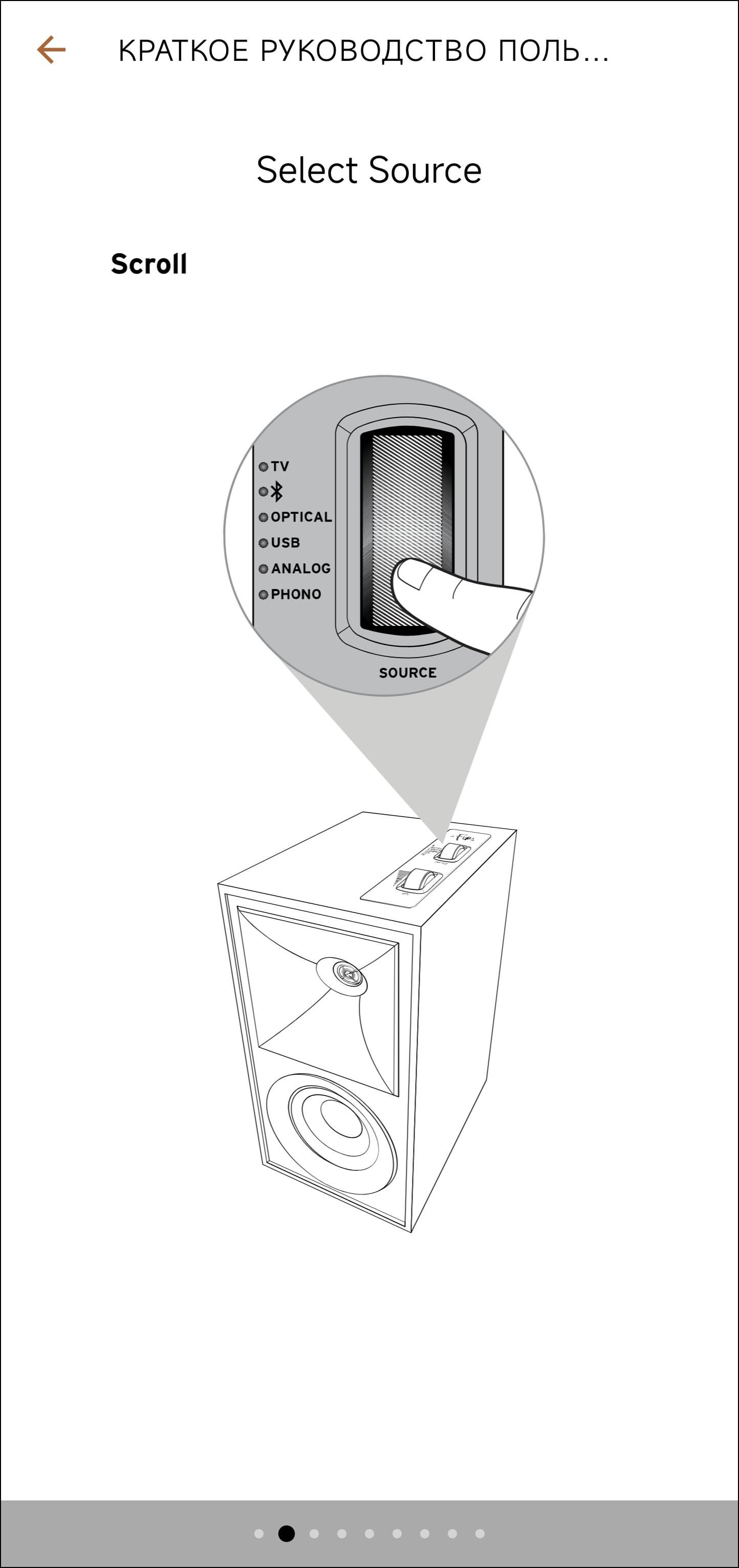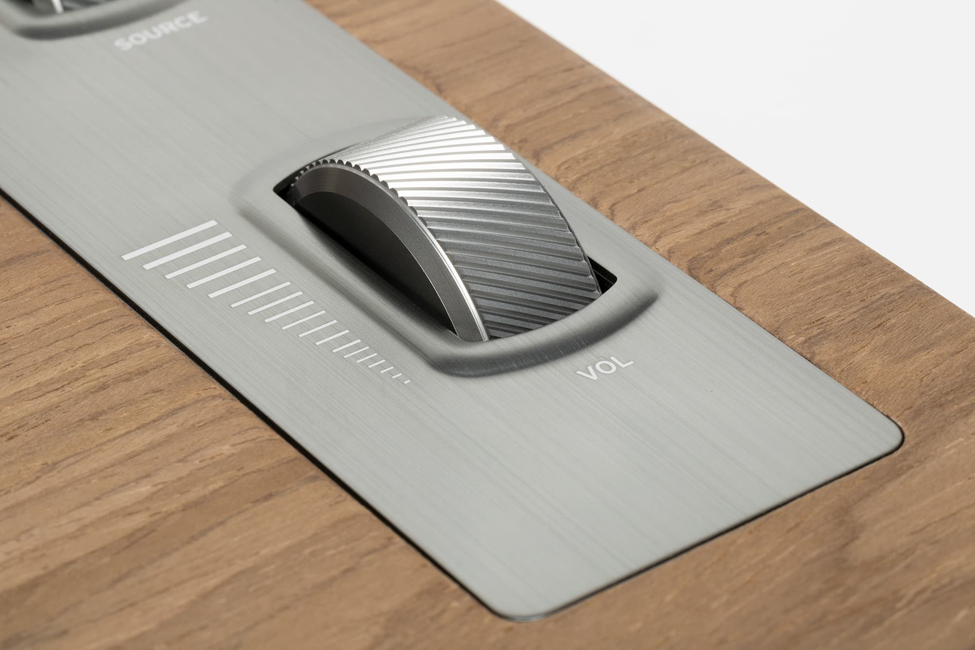 Колеса управления на верхней панели вращаются с небольшим усилием, но при этом обладают приятным дискретным ходом. Пользоваться ими — одно удовольствие: никаких лишних люфтов, регулировка происходит четко и без «прыжков» через два-три значения. Верхний регулятор отвечает за выбор входа: TV, Bluetooth, Optical, USB, Analog, Phono. Индикаторы справа показывают, какой из них активен. Они же ответственны за демонстрацию уровня громкости во время регулировки — полоса заполняется сверху вниз по мере ее увеличения.