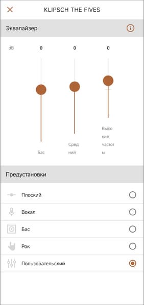 С помощью кнопки на главном экране сразу перейдем на вкладку эквалайзера. Есть несколько пресетов, а также возможность создавать свои. Правда полосы всего три, но чуть подстроить звучание под себя они все же позволяют.