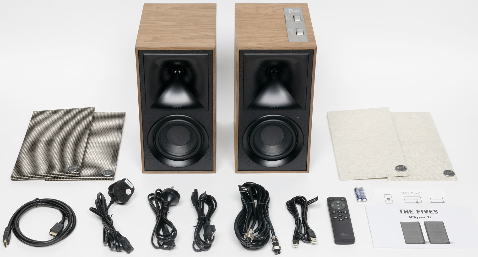 В комплект поставки входят колонки — активная и пассивная, а также две пары передних решеток, межблочный кабель, USB-кабель, HDMI-кабель, пульт дистанционного управления и документация. В приехавшем к нам комплекте оказалось аж три типа кабелей для подключения к сети, но тут явно есть варианты в зависимости от страны поставки. Приятно, что производитель позаботился о том, чтобы колонки полностью соответствовали девизу «купил и включил» — все необходимое есть в комплекте, докупать придется разве что кабель для аналогового подключения к источнику звука, который нужен далеко не всем.