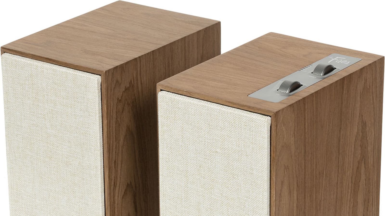Как уже упоминалось выше, со светлыми грилями колонки выглядят очень приятно, но при этом лаконично — лишнего внимания к себе не привлекают. И вот именно в таком виде дизайн сильнее всего напоминает что-то из середины прошлого века — о том, что на дворе все же XXI век, напоминают лишь ПДУ и ручки управления на верхней панели активной колонки.