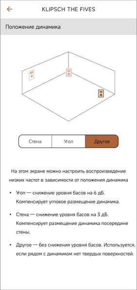 Также из приложения можно регулировать громкость сабвуфера, если он подключен — в противном случае настройка неактивна. Крайне полезная функция — изменение уровня баса в зависимости от размещения колонок: возле стены, в углу или на открытом пространстве.