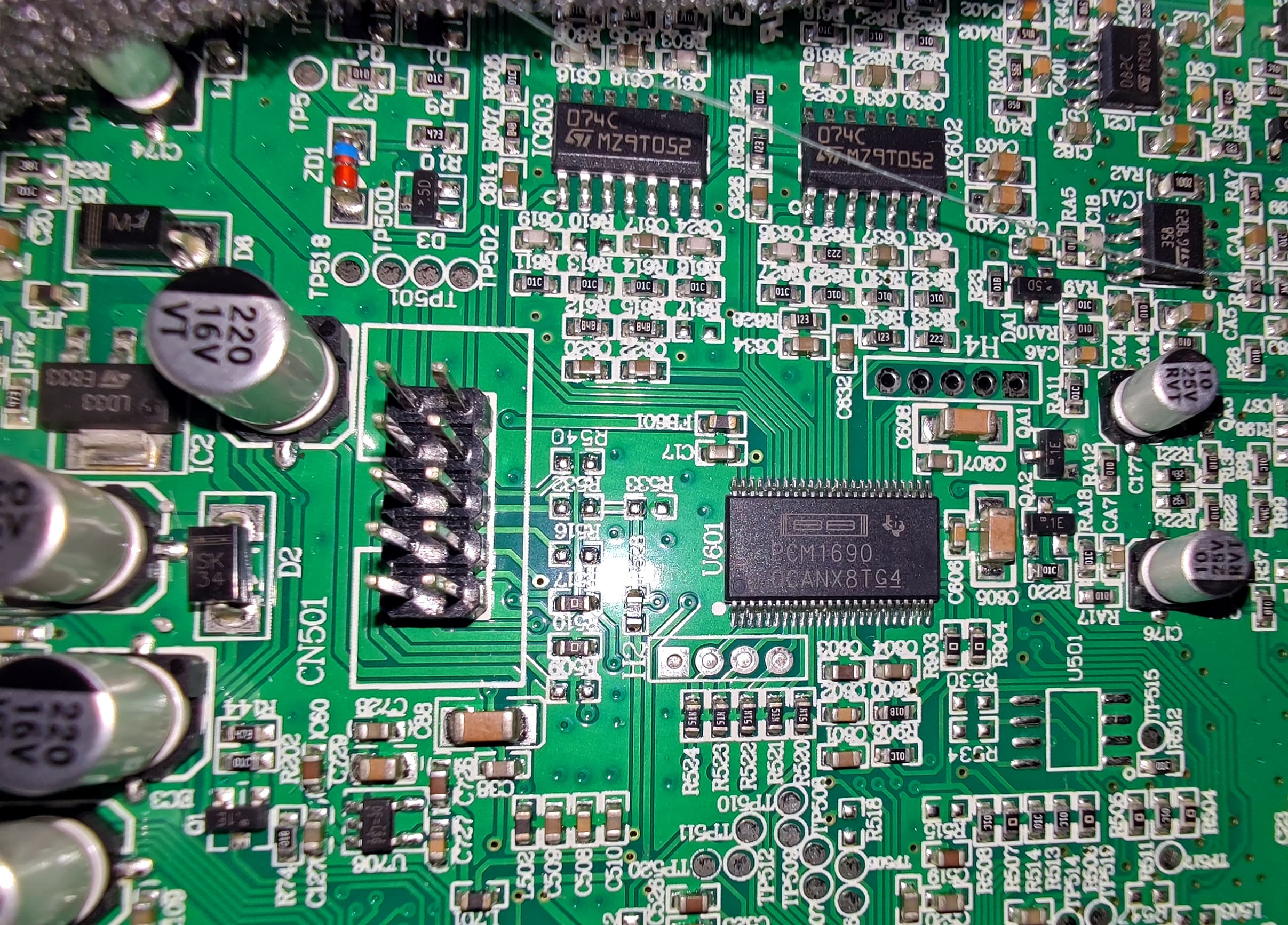 В качестве DSP задействована Analog Devices ADAU1462, выше нее размещен ЦАП PCM1690 принадлежащего ныне Texas Instruments бренда Burr-Brown. АЦП тоже имеется — PCM1862 авторства все тех же Texas Instruments.