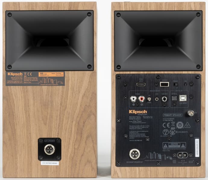 Порты фазоинверторов Klipsch The Fives выведены назад, а потому размещать их лучше на расстоянии от стен: пары десятков сантиметров будет достаточно, но тут всегда есть пространство для экспериментов. Особенно если учесть наличие у акустики функции Dynamic Bass EQ, позволяющей динамически изменять акцент на НЧ-регистре в зависимости от громкости. Что же касается подключения источников, то тут все очень интересно и разнообразно.