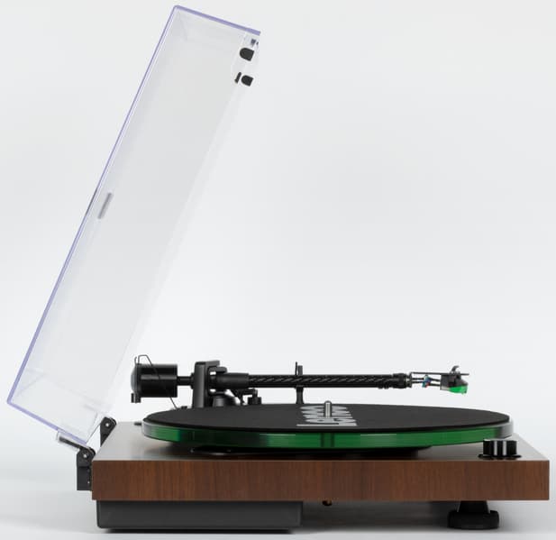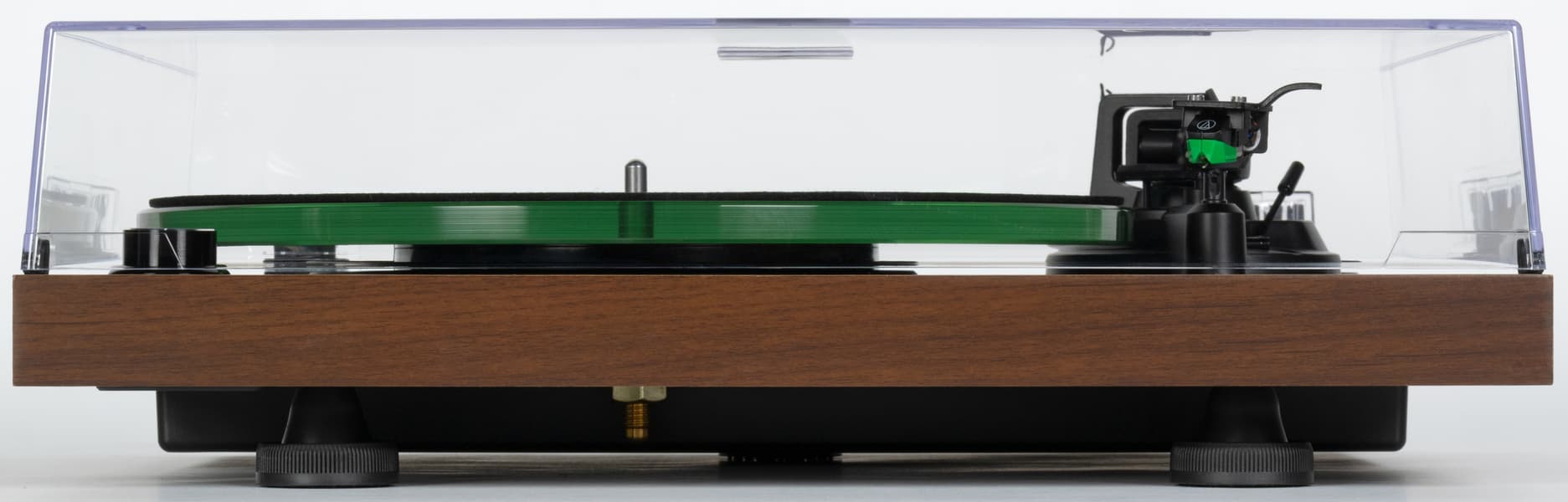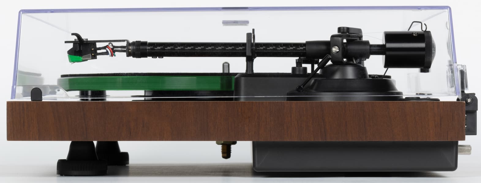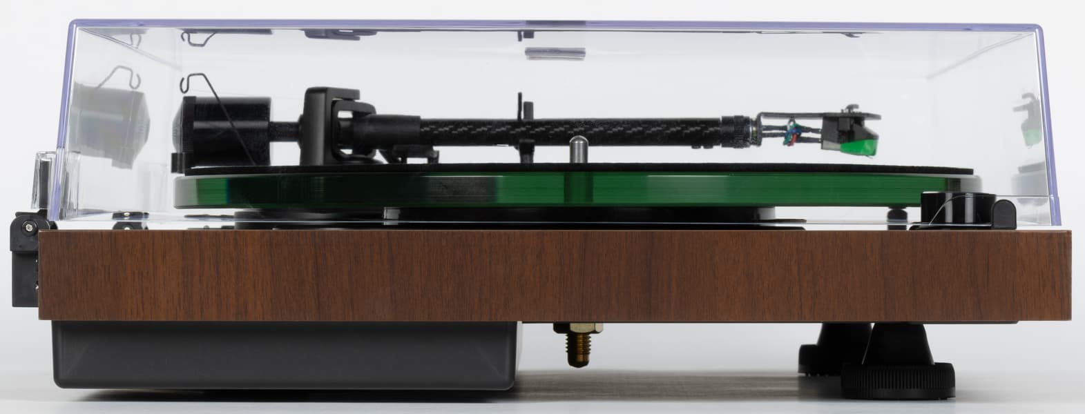 При взгляде сбоку заметно, что даже будучи прикрытым слипматом и пластинкой, стеклянный диск все равно вносит свою лепту в эффектный внешний вид проигрывателя.