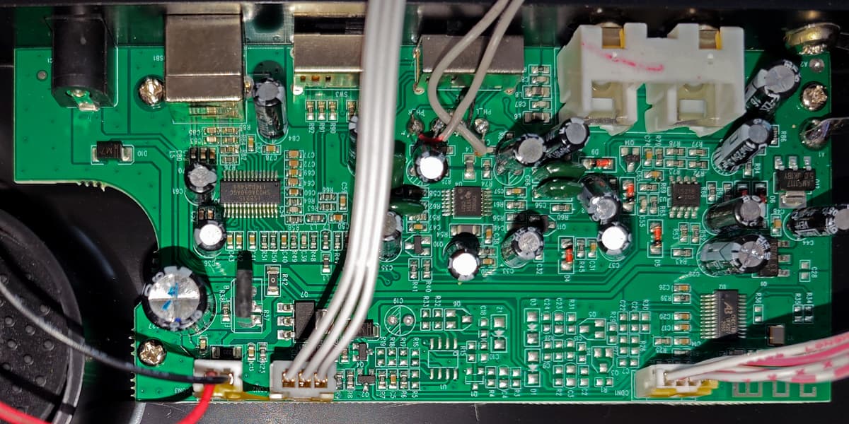 Кожух на дне удерживается шестью шурупами и легко снимается, под ним обнаруживается небольшая плата. Собрана она на достойном уровне качества, компоненты в основном китайских производителей и бюджетные.