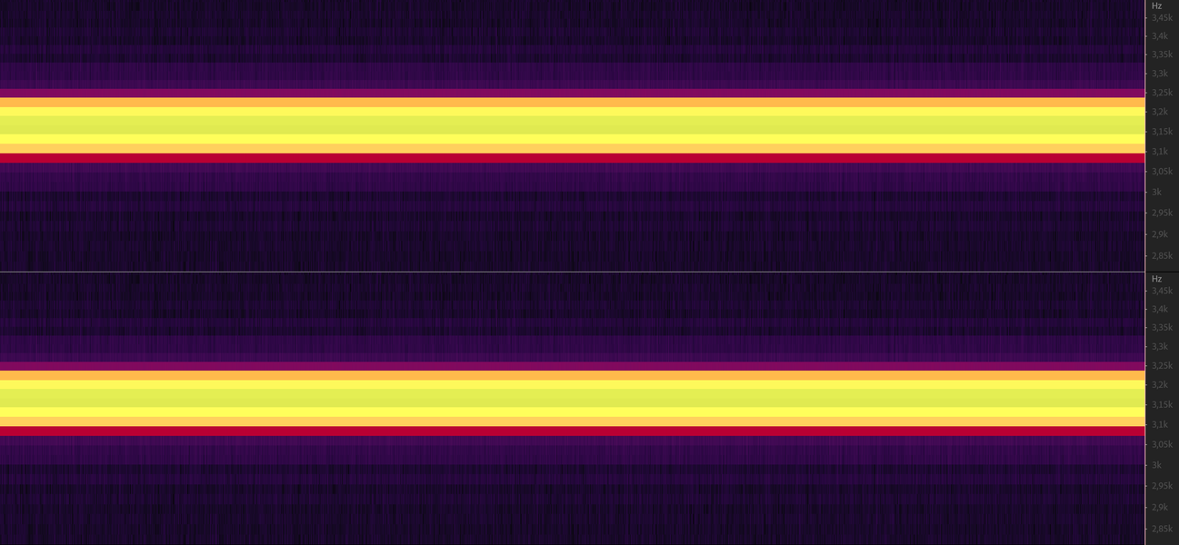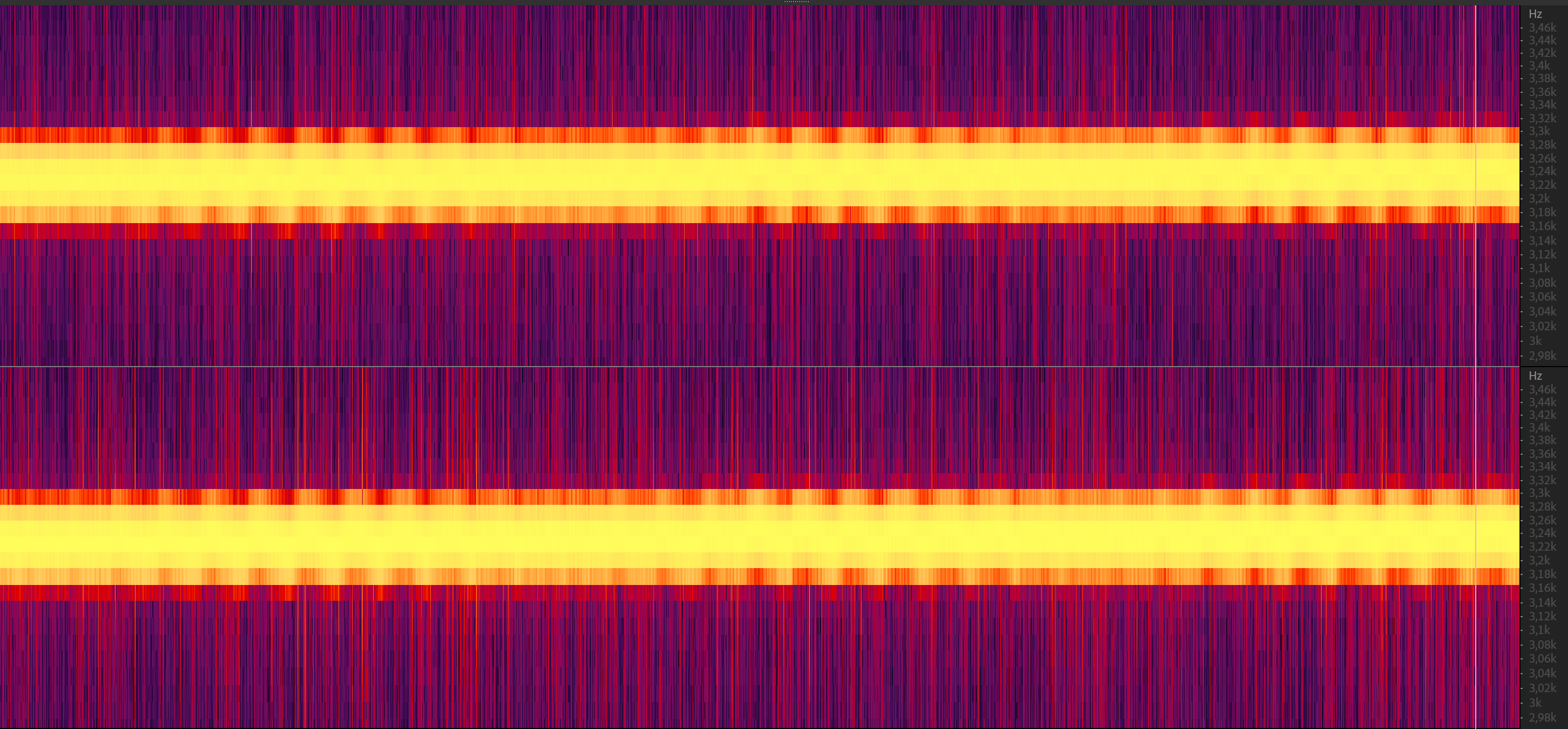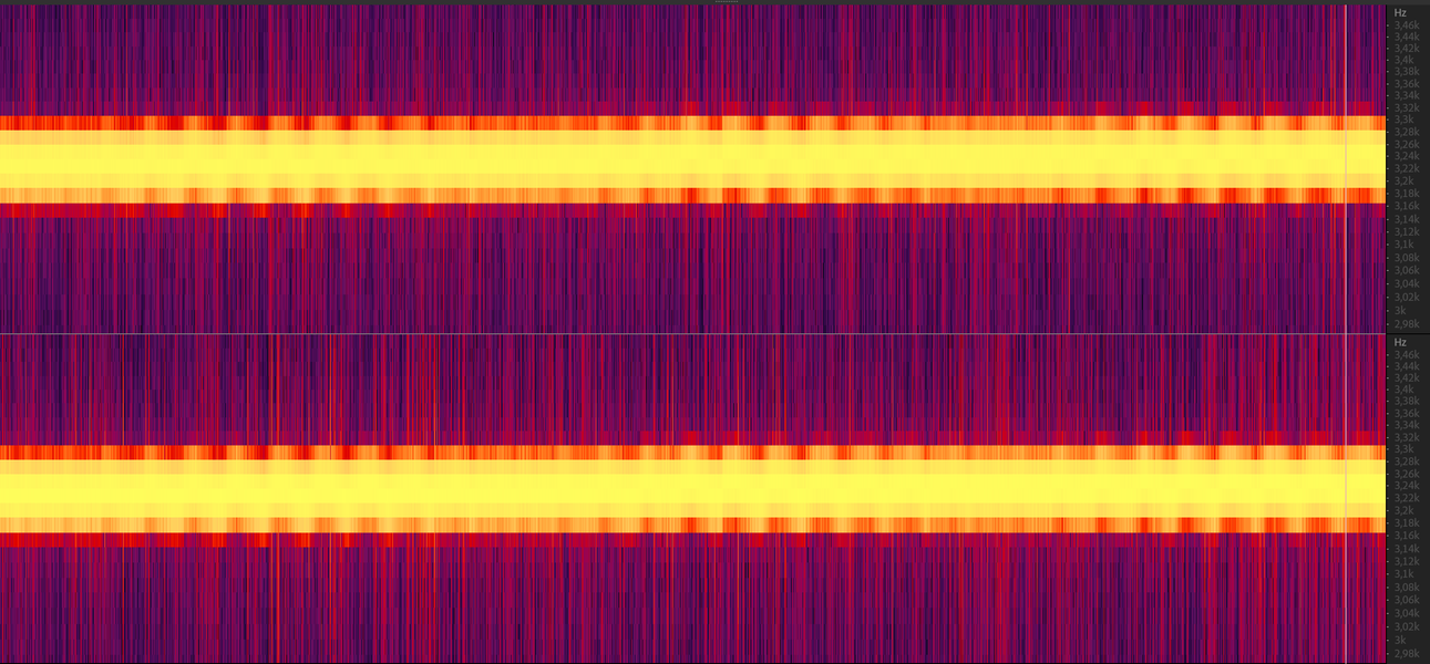 Следующий наш тест призван проверить так называемый «коэффициент детонаций», в англоязычной литературе называемый wow&flutter. Показывает он способность проигрывателя поддерживать стабильную скорость вращения пластинки. Wow — это медленное «плавание» звука, искажающее высоту звучания. Ну а Flutter — это «дрожание» скорости, приводящее к снижению детализации. В качестве теста запишем сигнал частотой 3150 Гц с тестовой пластинки и посмотрим на его спектрограмму.