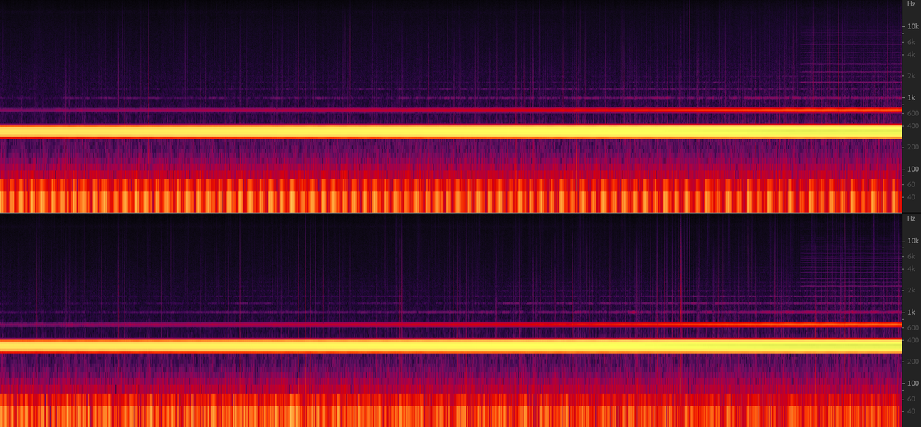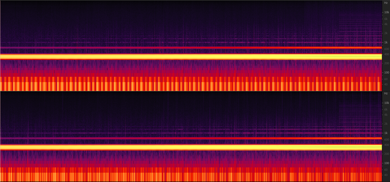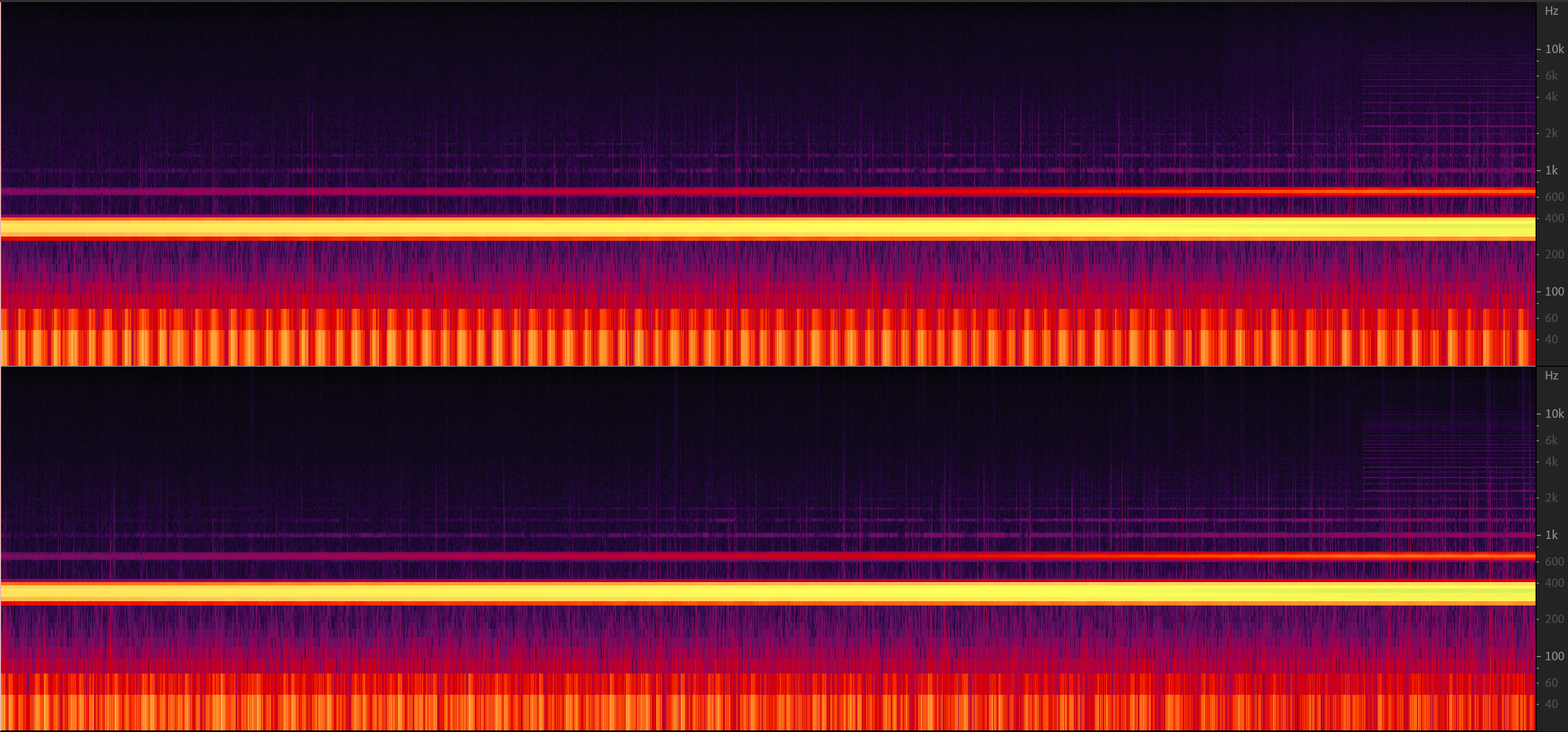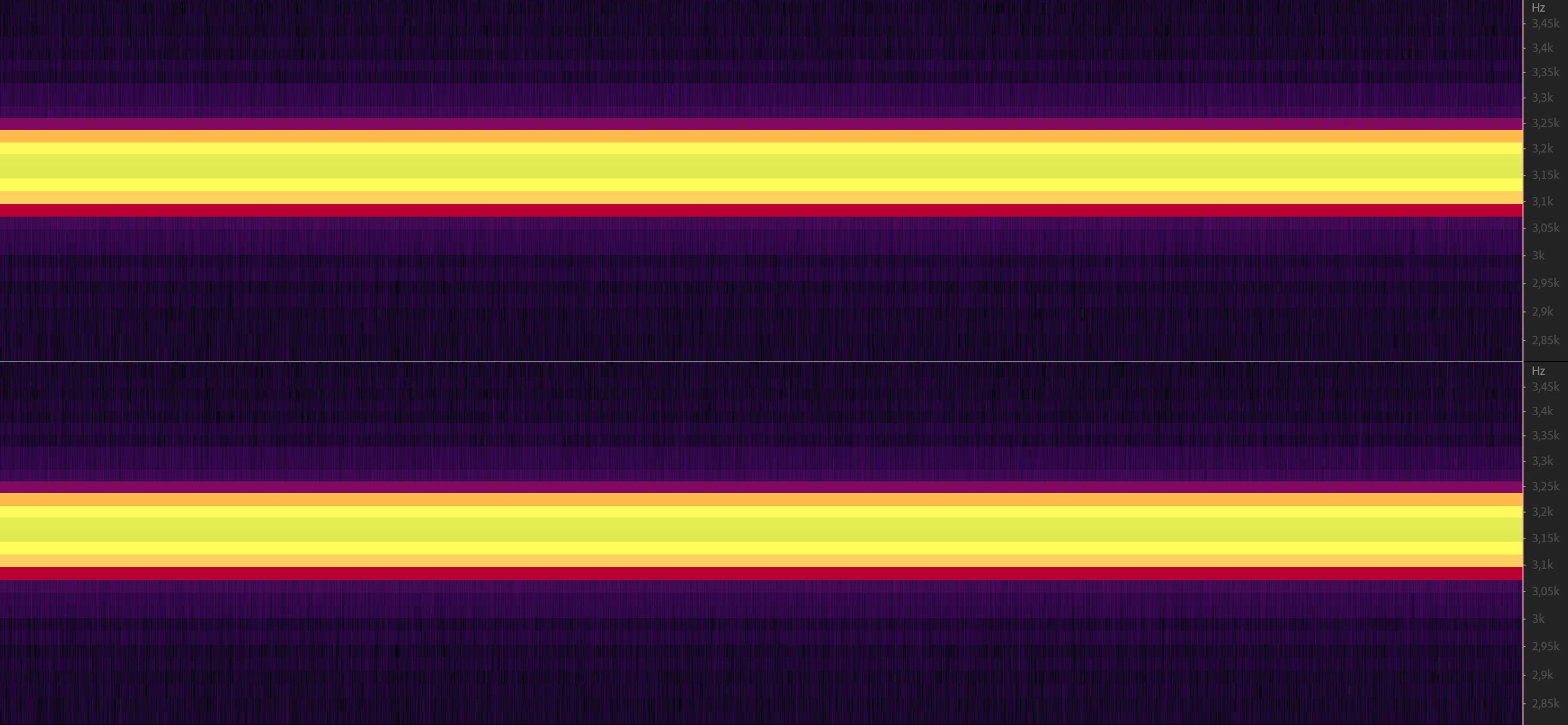 Следующий наш тест призван проверить так называемый «коэффициент детонаций», в англоязычной литературе называемый wow&flutter. Показывает он способность проигрывателя поддерживать стабильную скорость вращения пластинки. Wow — это медленное «плавание» звука, искажающее высоту звучания. Ну а Flutter — это «дрожание» скорости, приводящее к снижению детализации. В качестве теста запишем сигнал частотой 3150 Гц с тестовой пластинки и посмотрим на его спектрограмму.