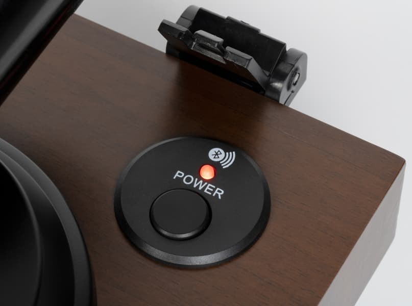 В правом верхнем углу стола проигрывателя размещена кнопка питания, которая при длительном нажатии управляет Bluetooth-подключением. Светодиодный индикатор выше отображает тип подключения: синий — беспроводное, красный — проводное.