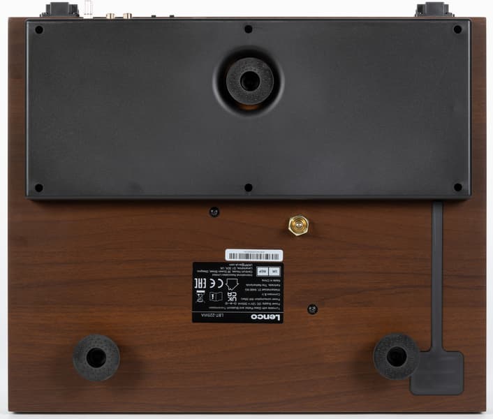 На дне размещены три ножки без возможности регулировать их высоту, придется внимательно следить за правильным положением поверхности, на которой Lenco LBT-225WA будет установлен. Под защитным кожухом находится электронная часть устройства.
