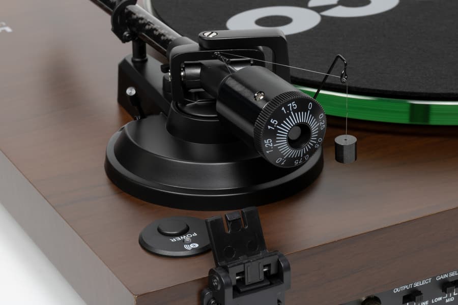 Судя по описанию производителя, тонарм выполнен из карбона. Опять-таки, учитывая общий уровень устройства, смысла в таких изысках не очень много. Но приятно, что он есть — выглядит симпатично. Система антискейтинга сделана в виде висящего на леске грузика, противовес оснащен шкалой и настраивается стандартным образом — вращением вокруг своей оси. Стойка тонарма выполнена из пластика, визуально кажется не самым надежным узлом устройства, но свою задачу выполняет.