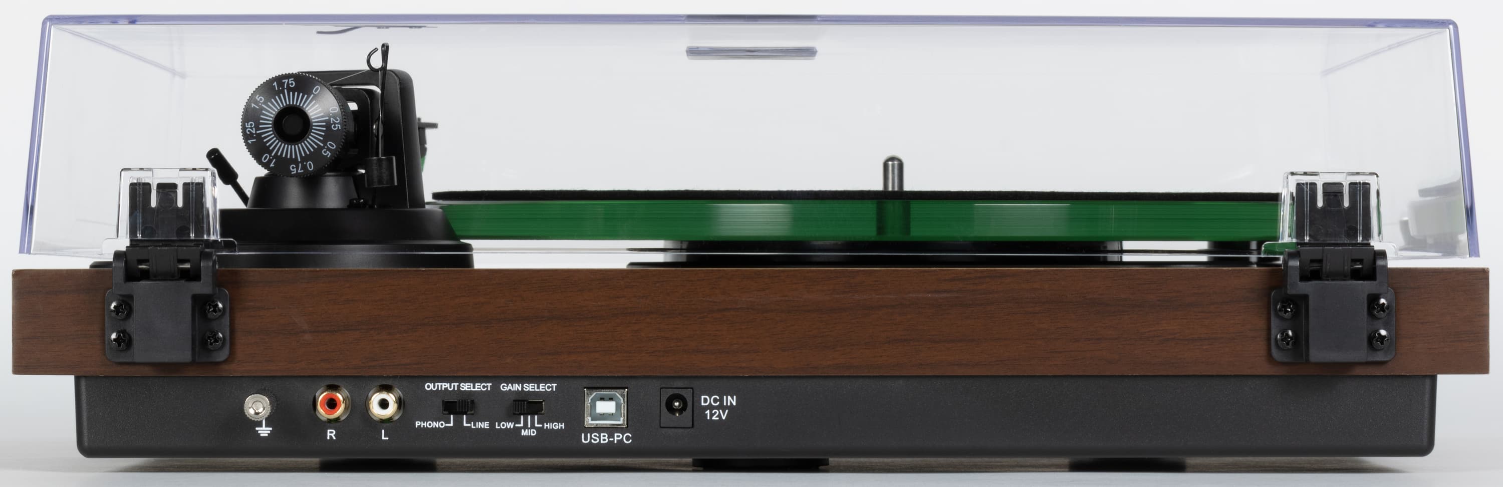 Разъемы для подключения расположены на задней панели. Выход RCA может работать в режимах Line или Phono — для подключения к усилителю или фонокорректору соответственно. В последнем случае пригодится клемма заземления, размещенная слева от разъема. Далее мы видим трехпозиционный переключатель коэффициента усиления — довольно редкое явление для подобных устройств, редкость которого объясняется отсутствием в нем острой необходимости. В общем, если вашему усилителю не хватает уровня сигнала на входе, можно переместить переключатель в положение Mid или даже High, в ходе тестирования вполне хватало положения Low как при работе с внешним усилителем, так и с активными мониторами.