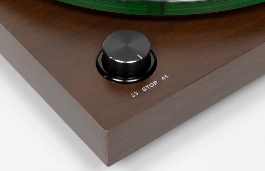 В левом нижнем углу размещен поворотный регулятор, запускающий вращение диска с разной скоростью. Работает он с неравномерным усилием и без четкого клика, но со своей функцией все же справляется.