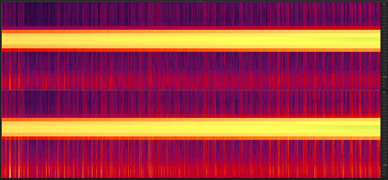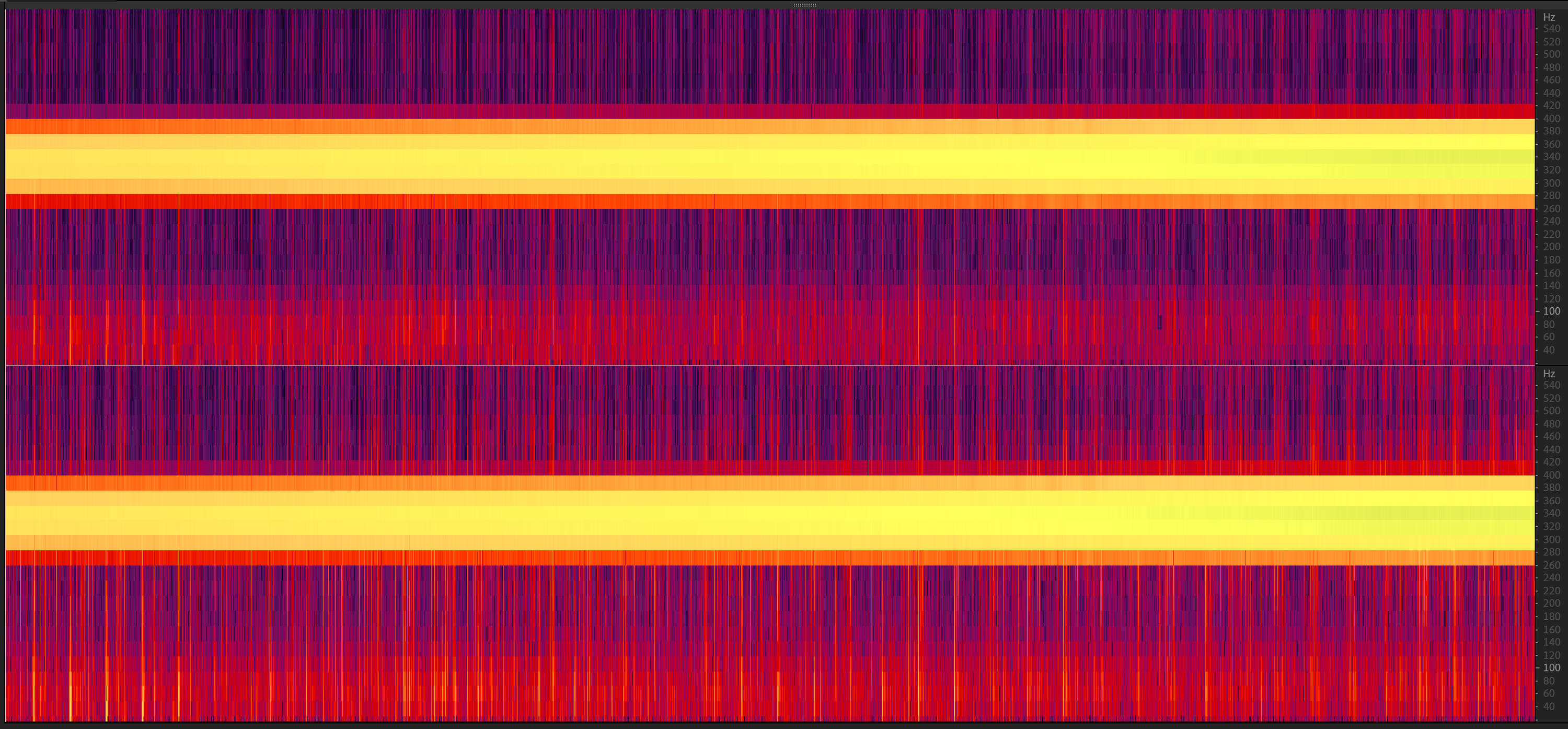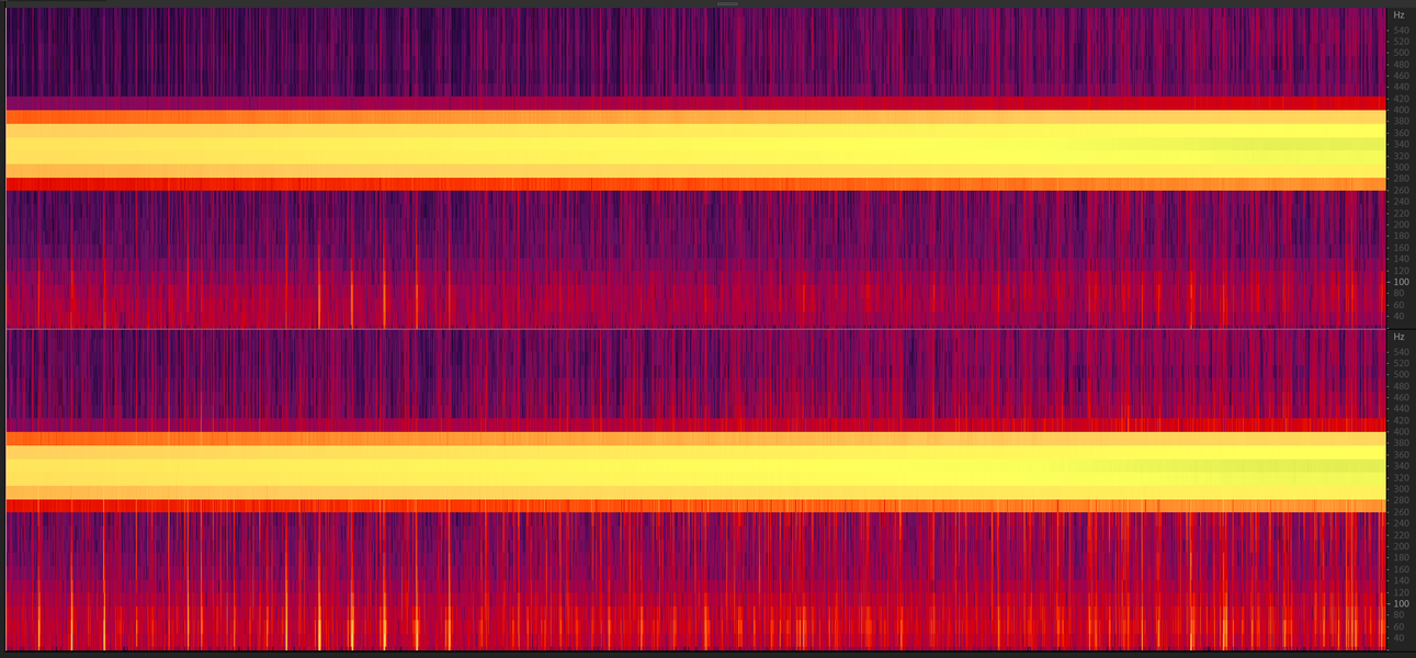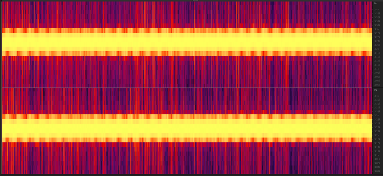 Следующий наш тест призван проверить так называемый «коэффициент детонаций», в англоязычной литературе называемый wow&flutter. Показывает он способность проигрывателя поддерживать стабильную скорость вращения пластинки. Wow — это медленное «плавание» звука, искажающее высоту звучания. Ну а Flutter — это «дрожание» скорости, приводящее к снижению детализации. В качестве теста запишем сигнал частотой 3150 Гц с тестовой пластинки и посмотрим на его спектрограмму.