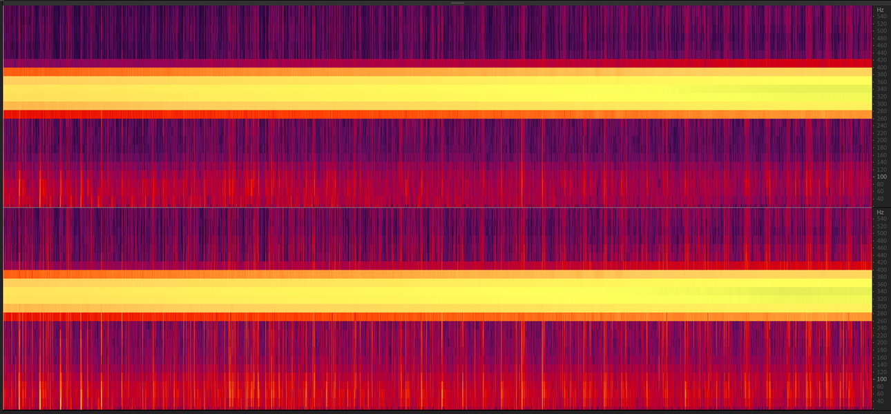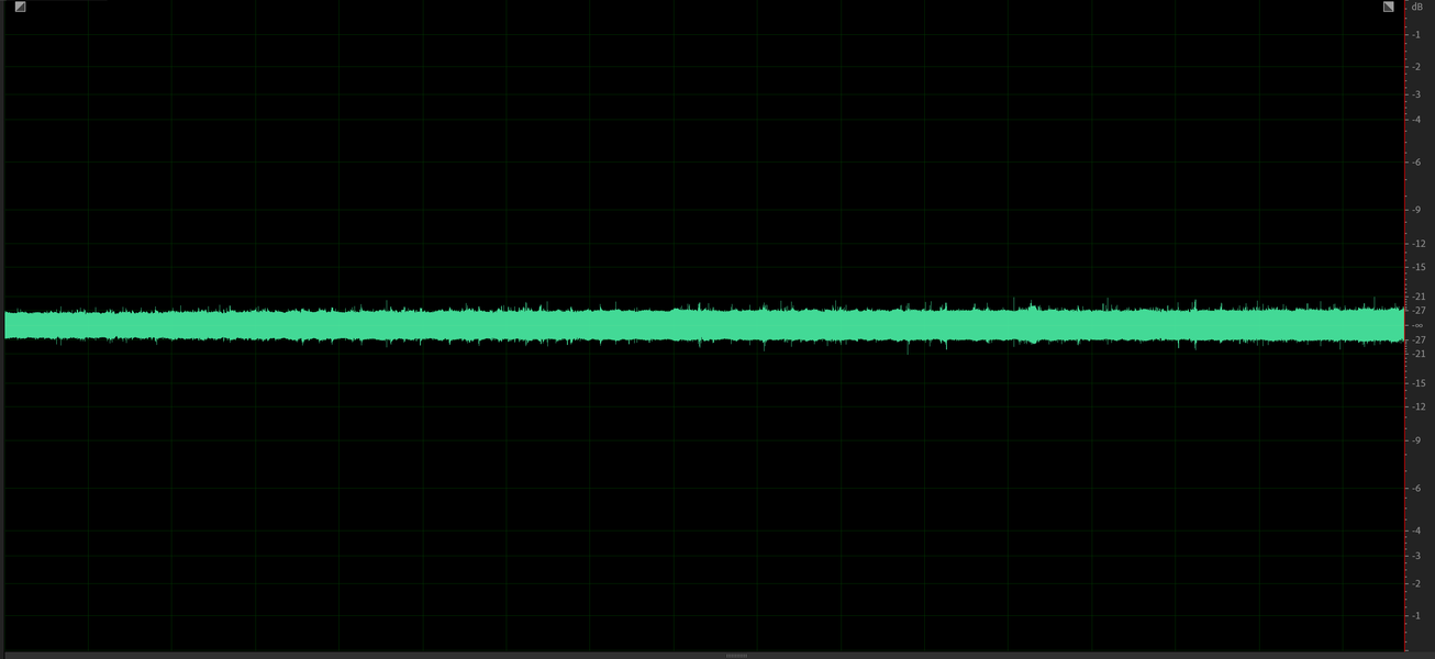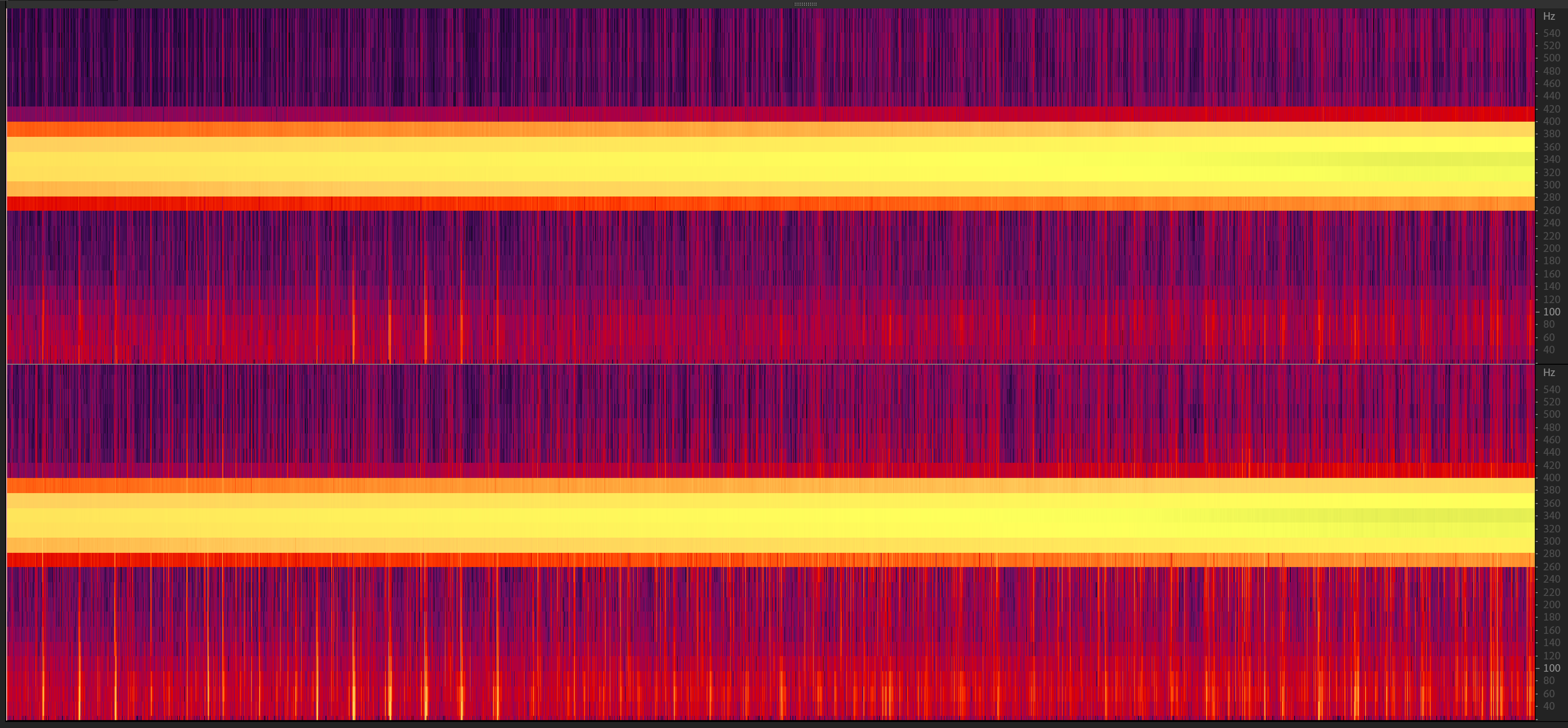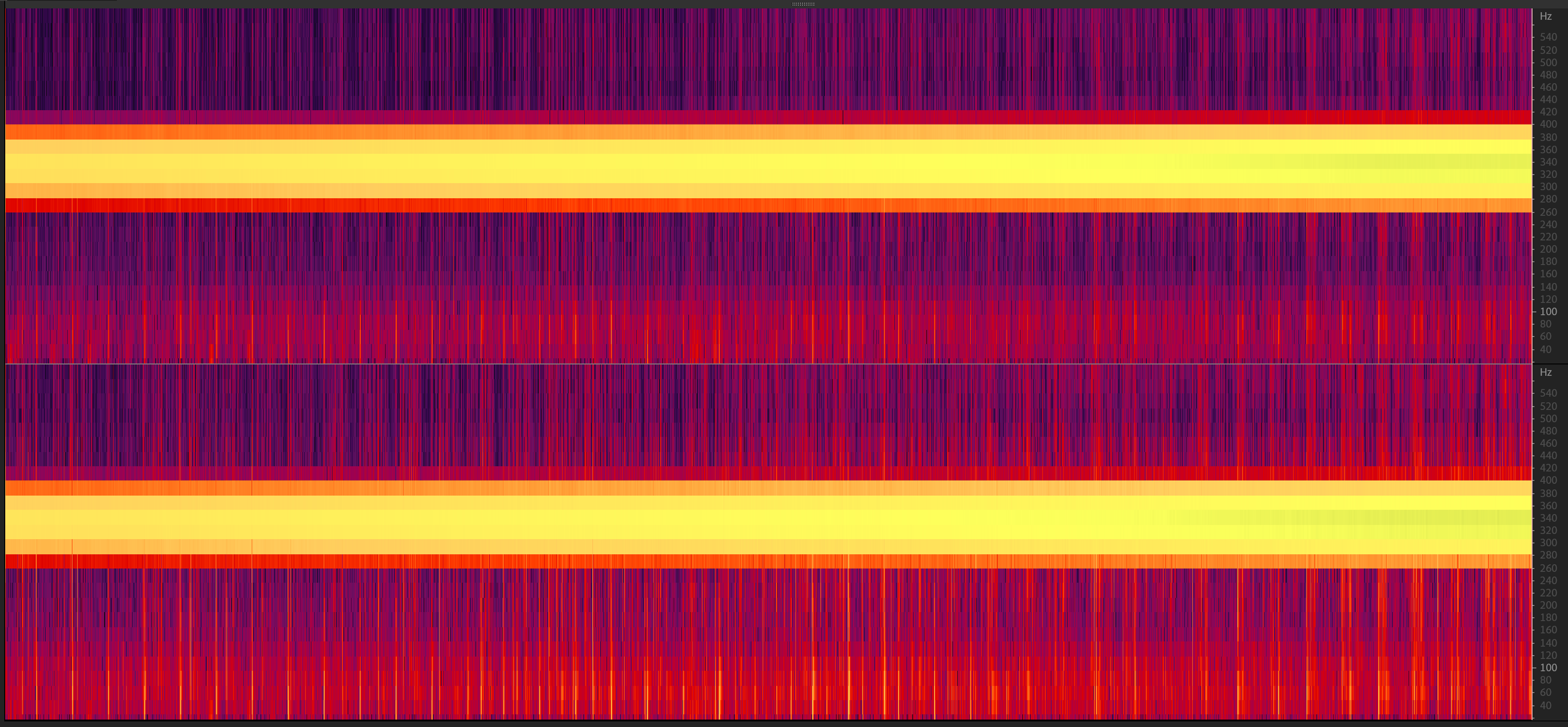 Следующий наш тест призван проверить так называемый «коэффициент детонаций», в англоязычной литературе называемый wow&flutter. Показывает он способность проигрывателя поддерживать стабильную скорость вращения пластинки. Wow — это медленное «плавание» звука, искажающее высоту звучания. Ну а Flutter — это «дрожание» скорости, приводящее к снижению детализации. В качестве теста запишем сигнал частотой 3150 Гц с тестовой пластинки и посмотрим на его спектрограмму.