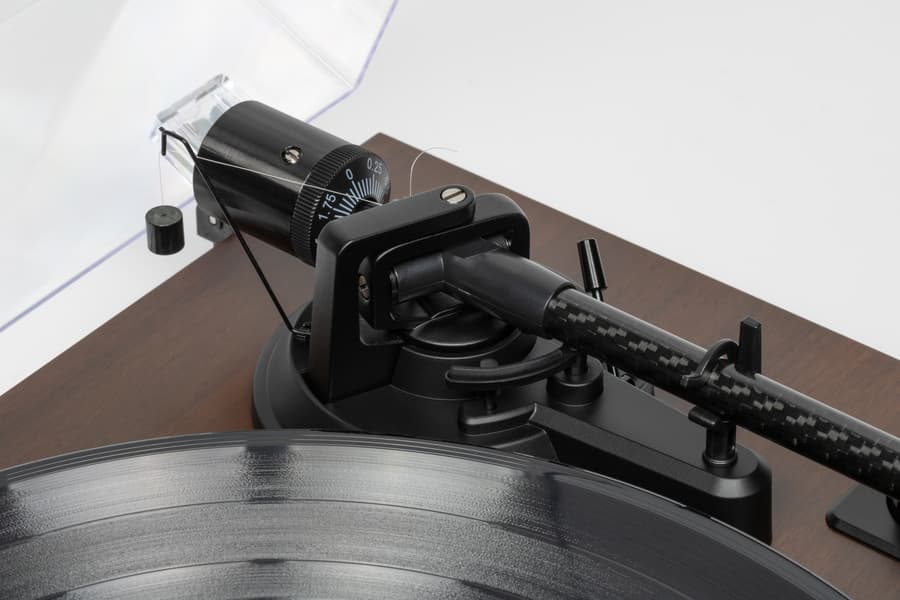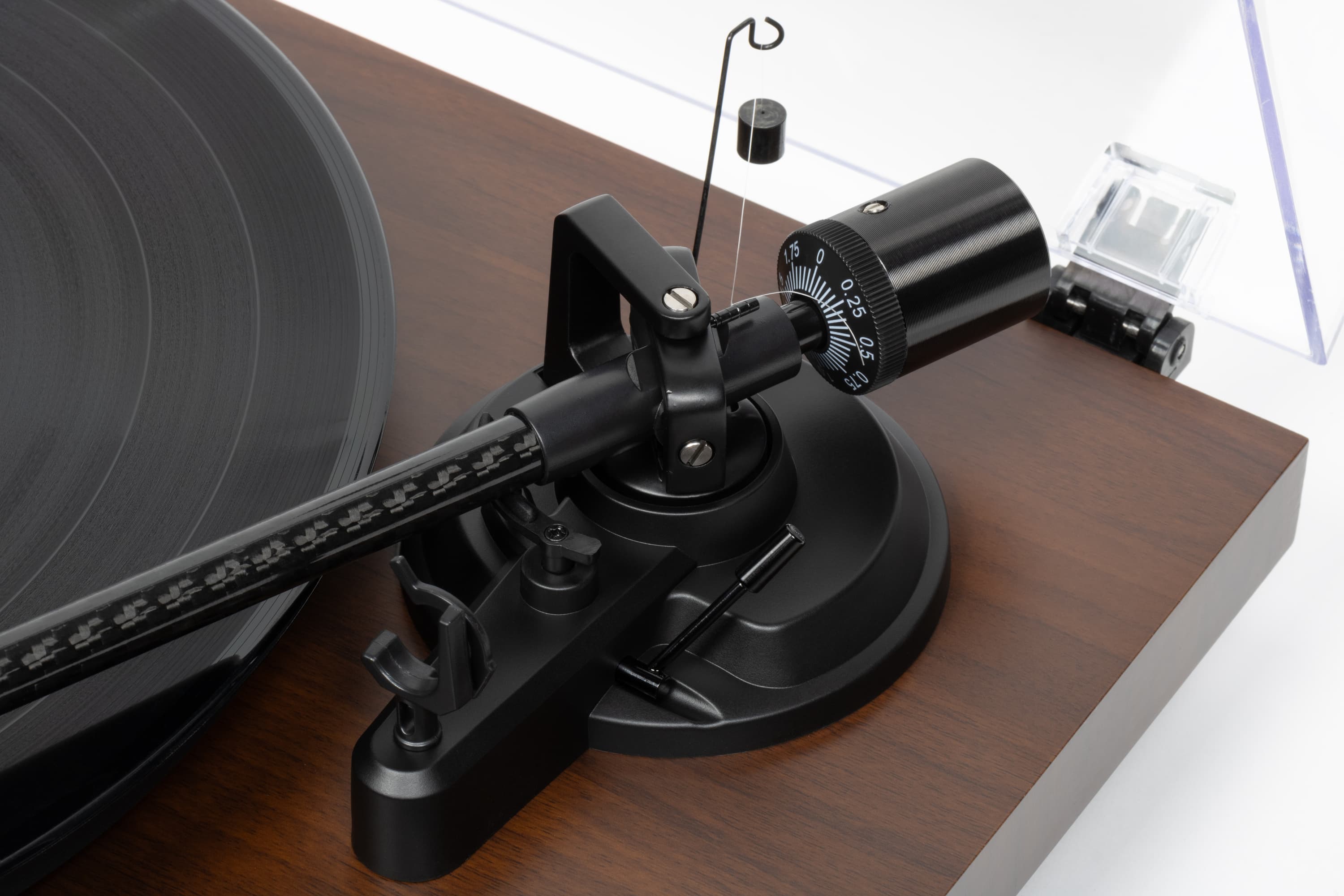 По заявлению производителя, тонарм выполнен из карбона, что не очень-то характерно для сравнительно бюджетных моделей. Его эффективность в данном случае можно подвергнуть сомнению, так как другие элементы сделаны явно попроще. Но, как минимум, это просто красиво. Система антискейтинга выполнена в виде висящего на леске грузика, противовес оснащен шкалой и настраивается классическим образом — вращением вокруг своей оси. Стойка тонарма сделана из пластика, ощущается немного хлипковатой, но со своей задачей справляется.