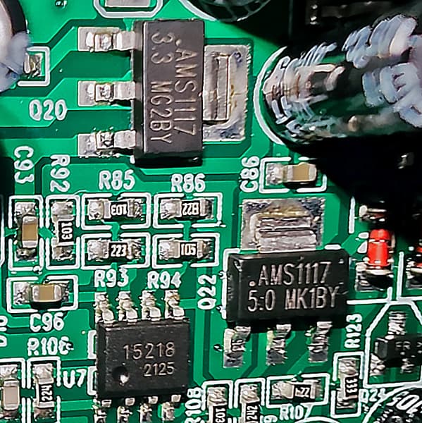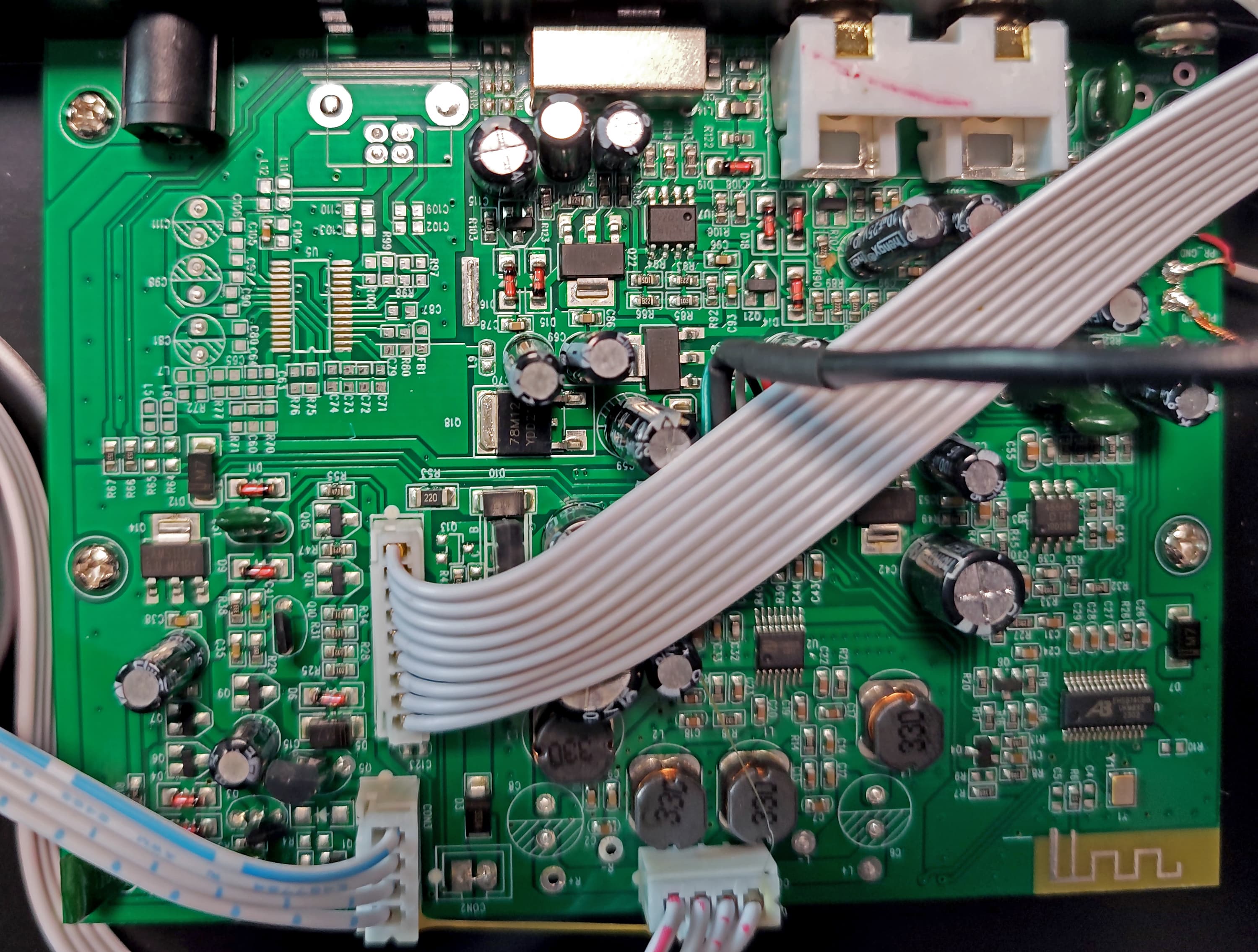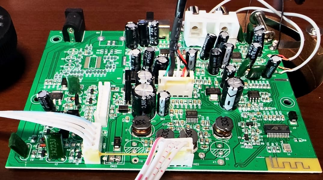 Первым делом бросаются в глаза конденсаторы Chongx DWBJ, справа внизу видна антенна Bluetooth, выполненная в виде дорожки на плате.