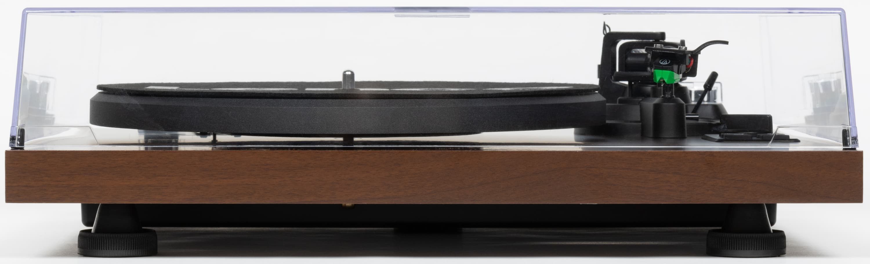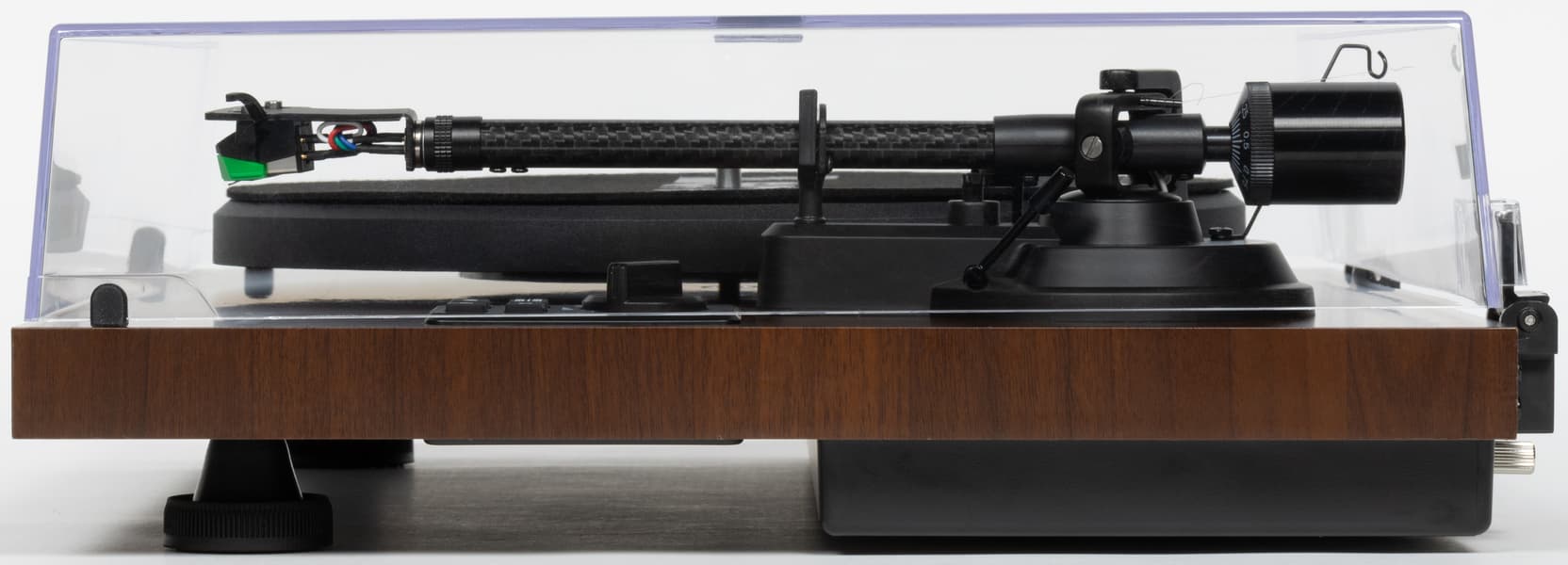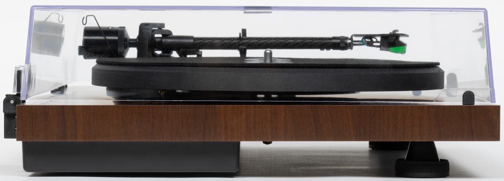 При взгляде сбоку хорошо видны все элементы, в частности — интересная фактура тонарма. По бокам крышки размещены небольшие демпферы, предотвращающие ее удары по столу. Они съемные и теоретически могут потеряться, парочку запасных мы обнаружили в комплекте — мелочь, но приятная.