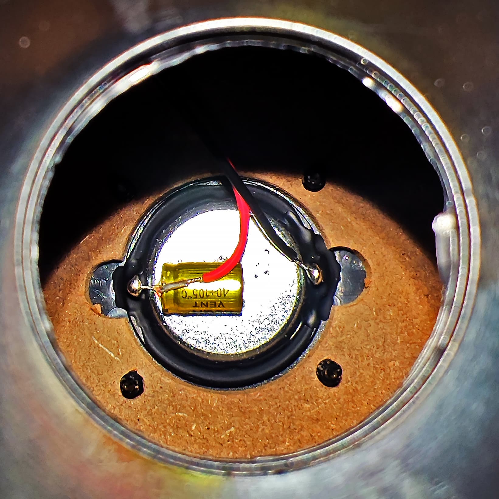 На твитере обнаружился конденсатор, выполняющий роль пассивного кроссовера. Качество монтажа удовлетворительное, мы видели намного хуже, причем даже в более дорогих устройствах.