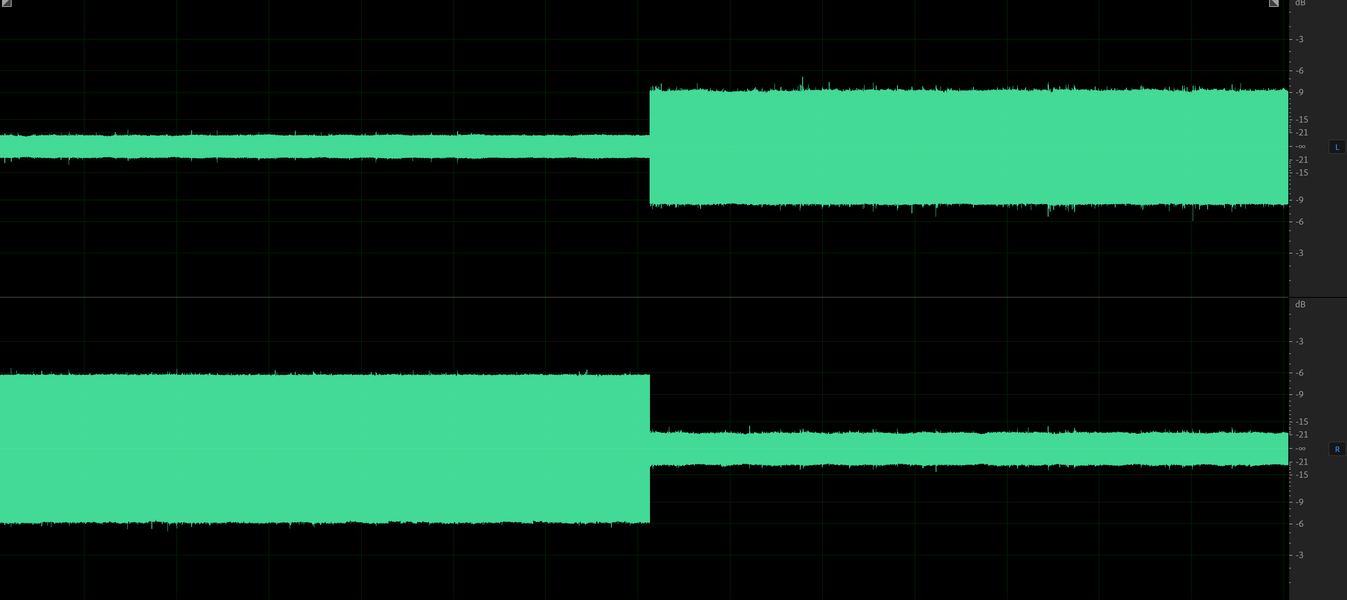 Продолжим эксперименты с проигрывателем. Сначала проверим, есть ли взаимопроникновение каналов. Для этого на тестовом диске есть сигнал частотой 1 кГц, записанный в противофазе на разных каналах. Запишем сигнал, на всякий случай проверим, что воспроизводится он на одном уровне громкости — с этим всё нормально.