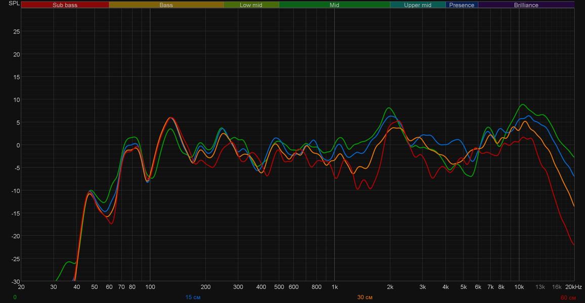 Теперь перейдем к рекомендованному положению. Картинка тоже далеко не идеальная, но искажений стало явно меньше, особенно на малой громкости. Правда, с ростом амплитуды мы видим ощутимый рост искажений в правом канале.