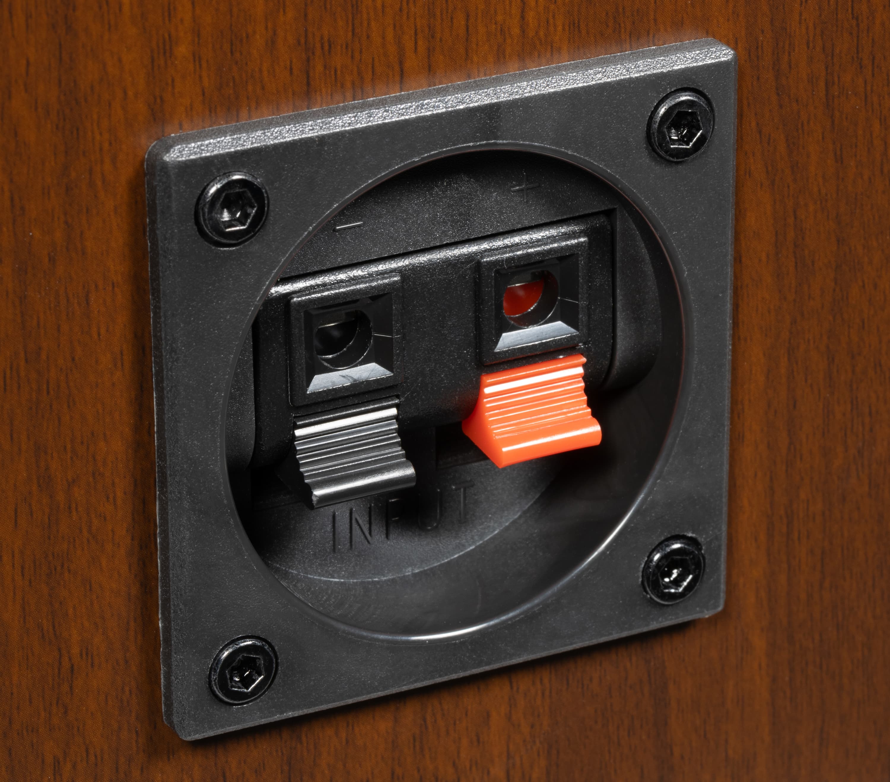 «Лапки» клемм легко нажимаются, при этом кабель держится в них надежно. Подключаем правую и левую колонку, ориентируясь по цветам клемм и кабеля.